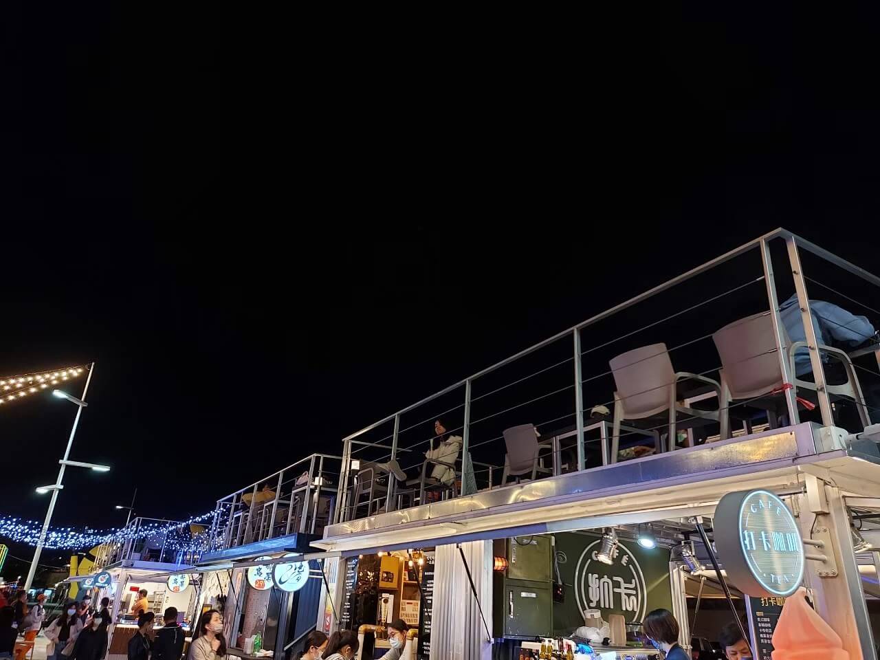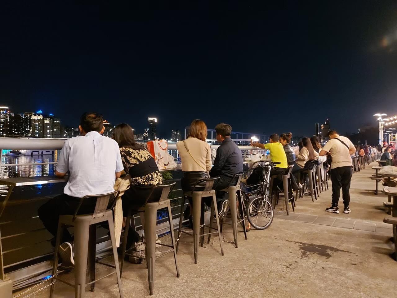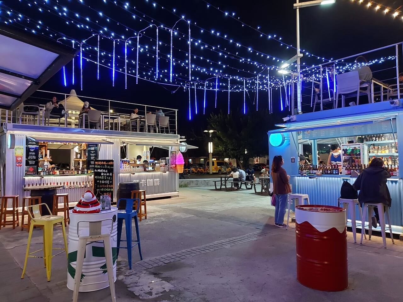 台北景點 大稻埕碼頭的聖誕貨櫃市集每個貨櫃上面都有座位,以視野來講很不錯,就是位置比較少,在靠近河岸邊則是有一整排的座位區,看夜景來說也是很好的選擇,而每個貨櫃店家的吧台前也都有設置幾個座位