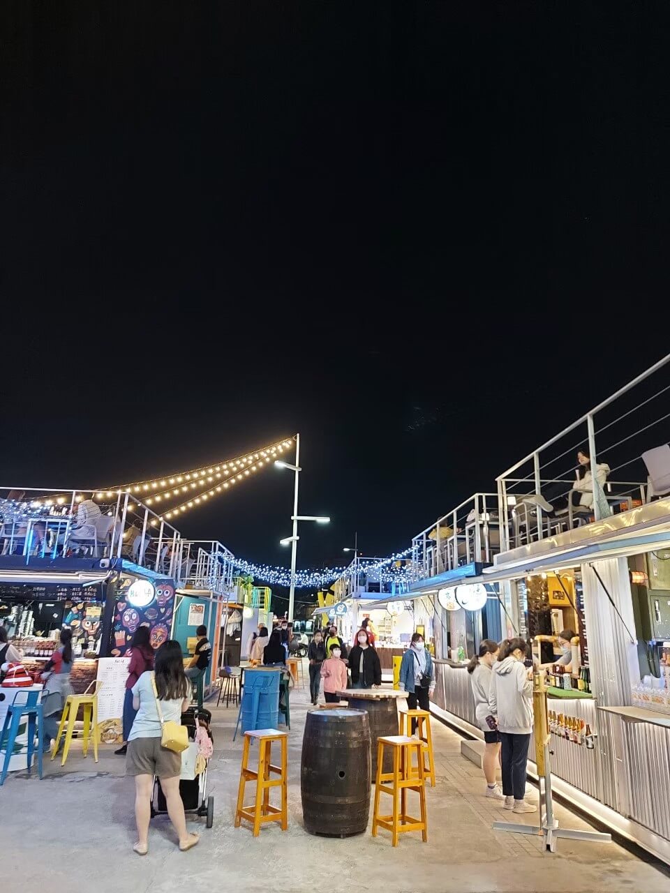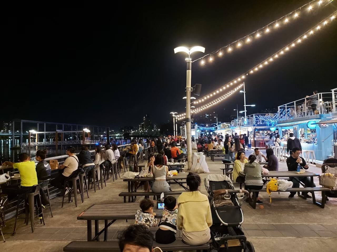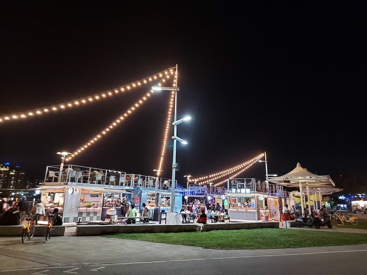 台北景點 大稻埕碼頭的聖誕貨櫃市集每個貨櫃上面都有座位,以視野來講很不錯,就是位置比較少,在靠近河岸邊則是有一整排的座位區,看夜景來說也是很好的選擇,而每個貨櫃店家的吧台前也都有設置幾個座位