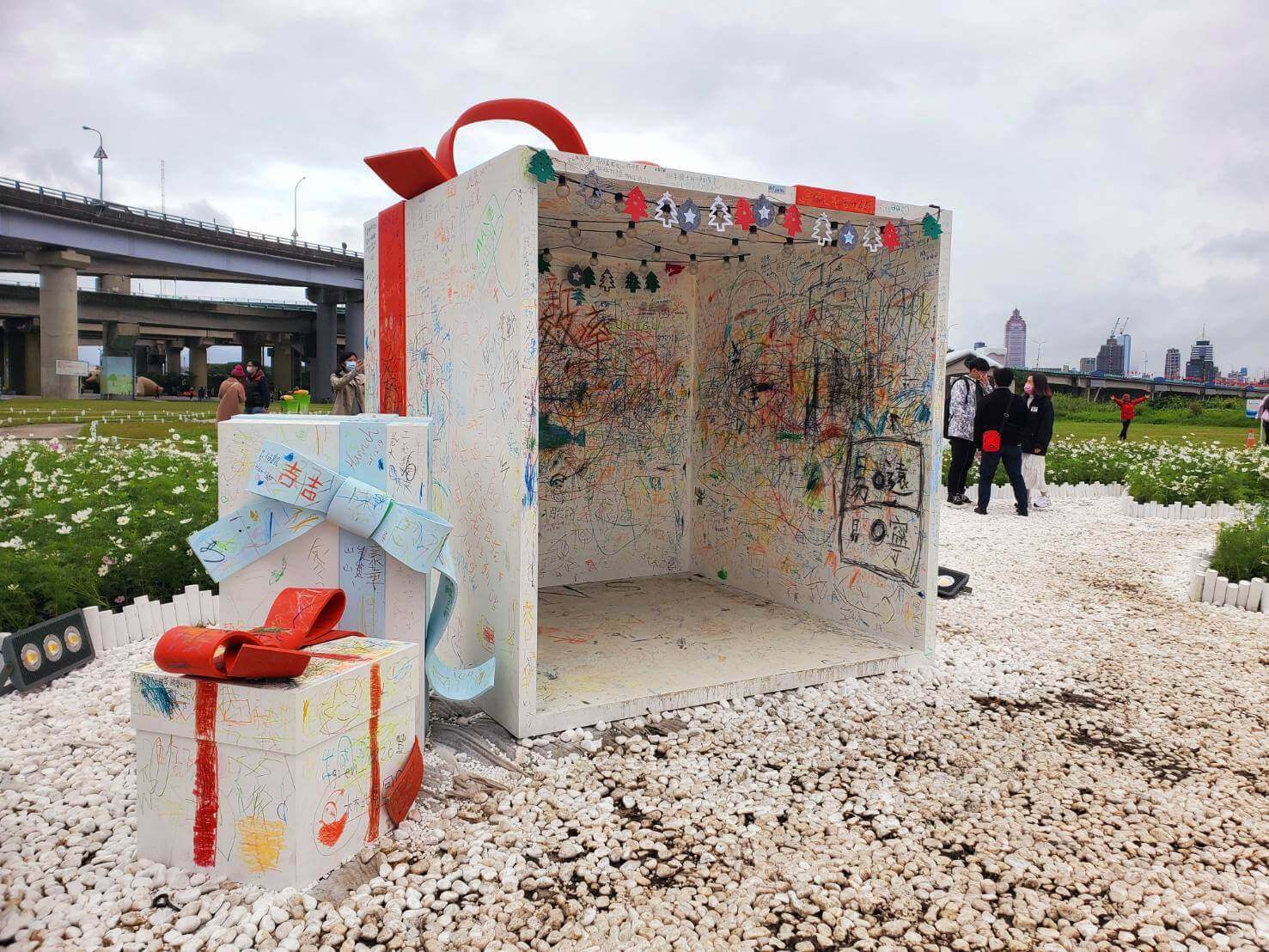而最酷的是,是這幾個白色的禮物盒,一旁有提供可以塗鴉的蠟筆,讓來訪的人可以幫禮物盒點綴,也有一種到此一遊的概念