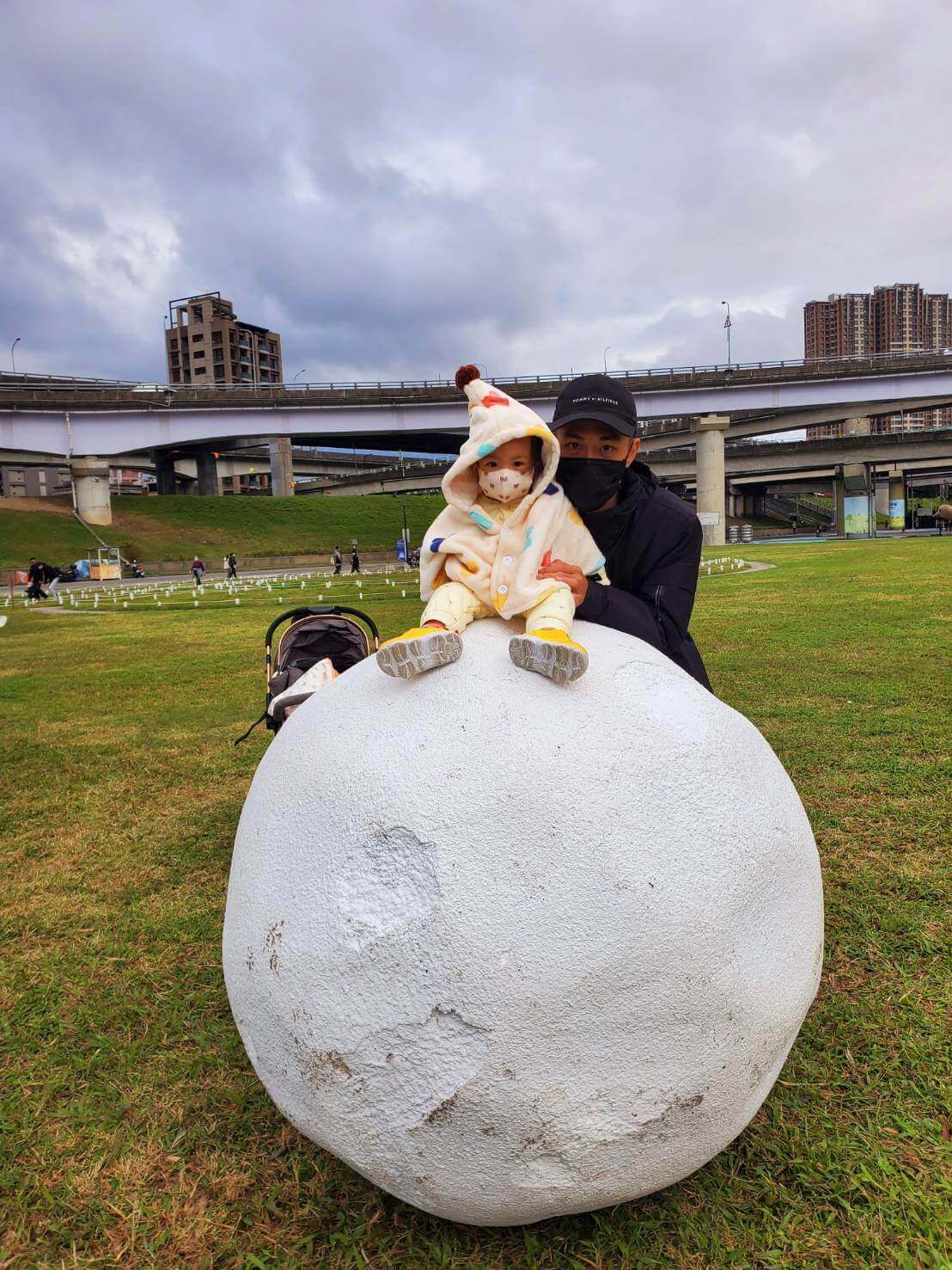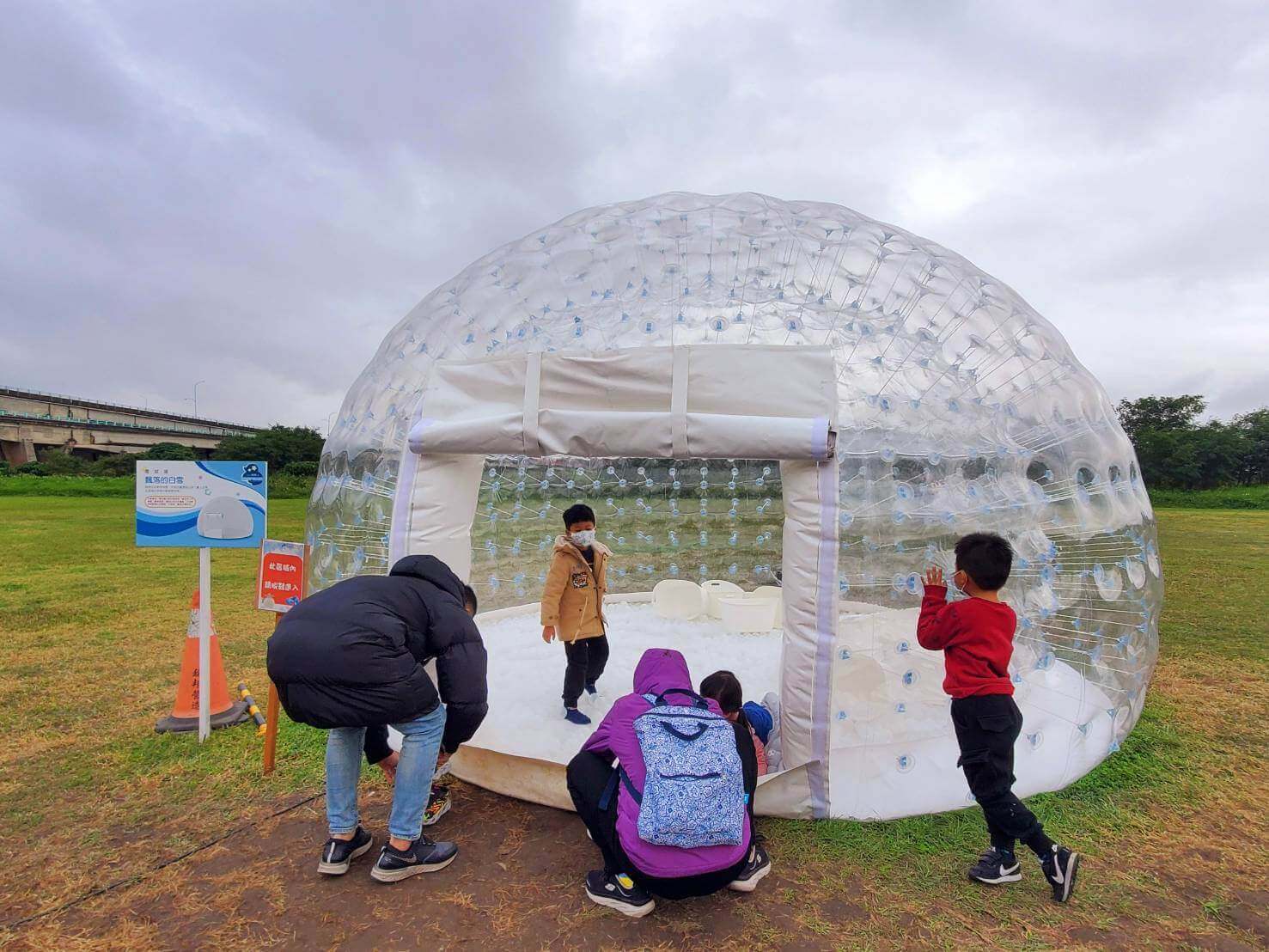 除了雪白世界以外,後方的草地上放了幾顆大大小小像雪球般的球體,雖然是在草地上,不過推著雪球網球走,有一種在堆雪球的錯覺,不少小朋友和爸爸媽媽在這裡玩的不亦樂乎,是最適合放風的地方了