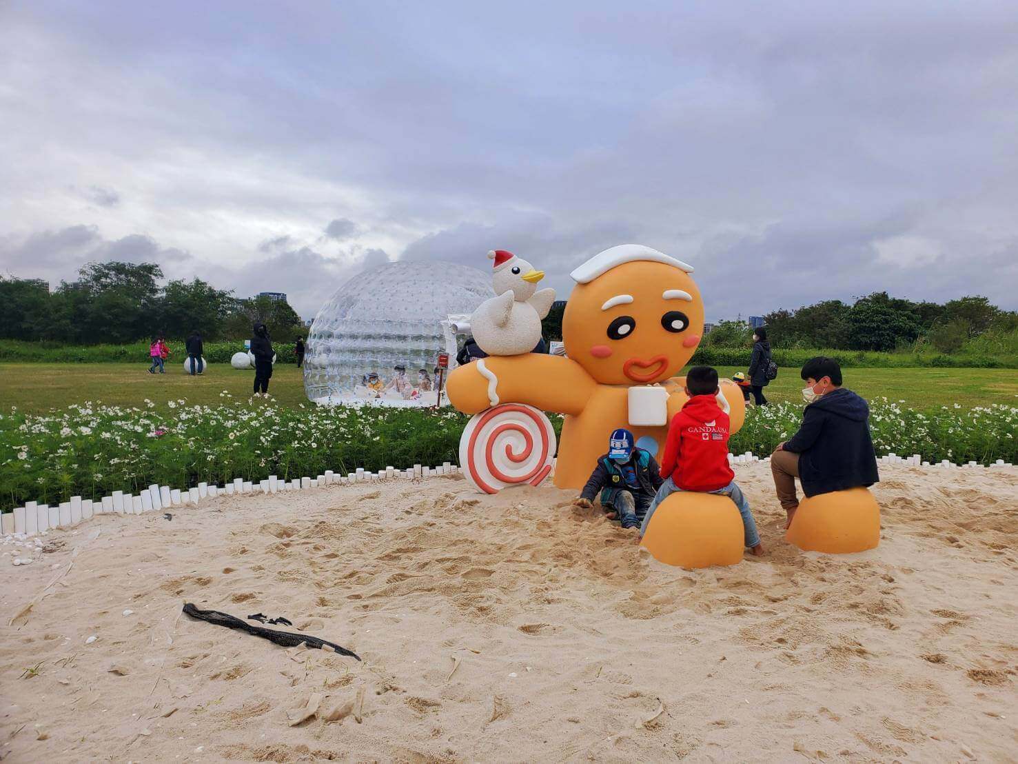 在這其中還有幾個比較有互動性和小朋友可以玩的,這裡有設置薑餅人沙坑、鴨鴨溜滑梯,還有泡泡球屋,光是這三個地點就足夠讓小朋友玩好一陣子了