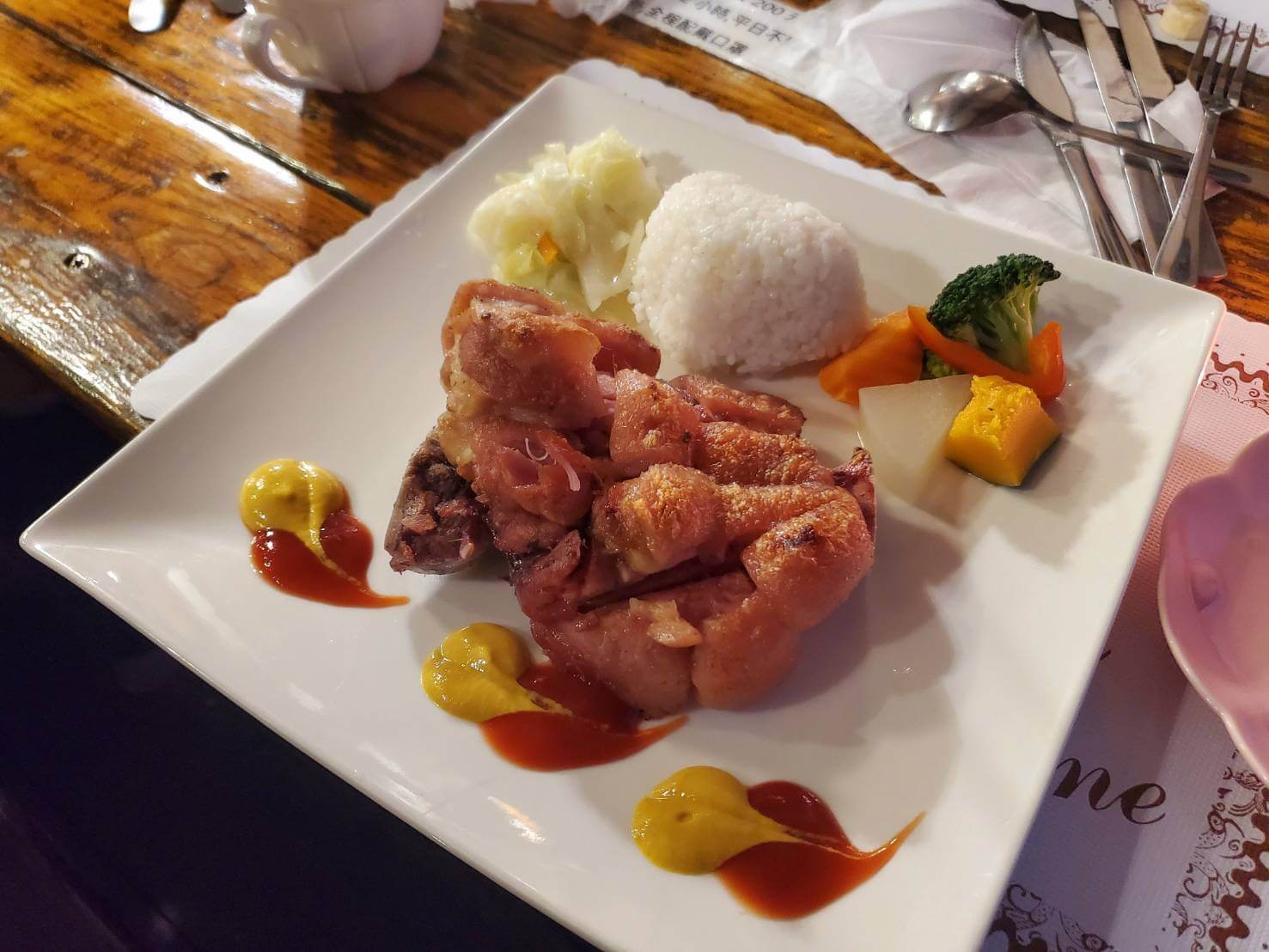 鬆餅的份量挺多的,兩個人分也綽綽有餘,外酥內軟很好吃,豬腳套餐的部分則是有包含湯品和沙拉,餐點溫度有點微溫,不過它卻是最後送上來的,不確定是因為什麼原因