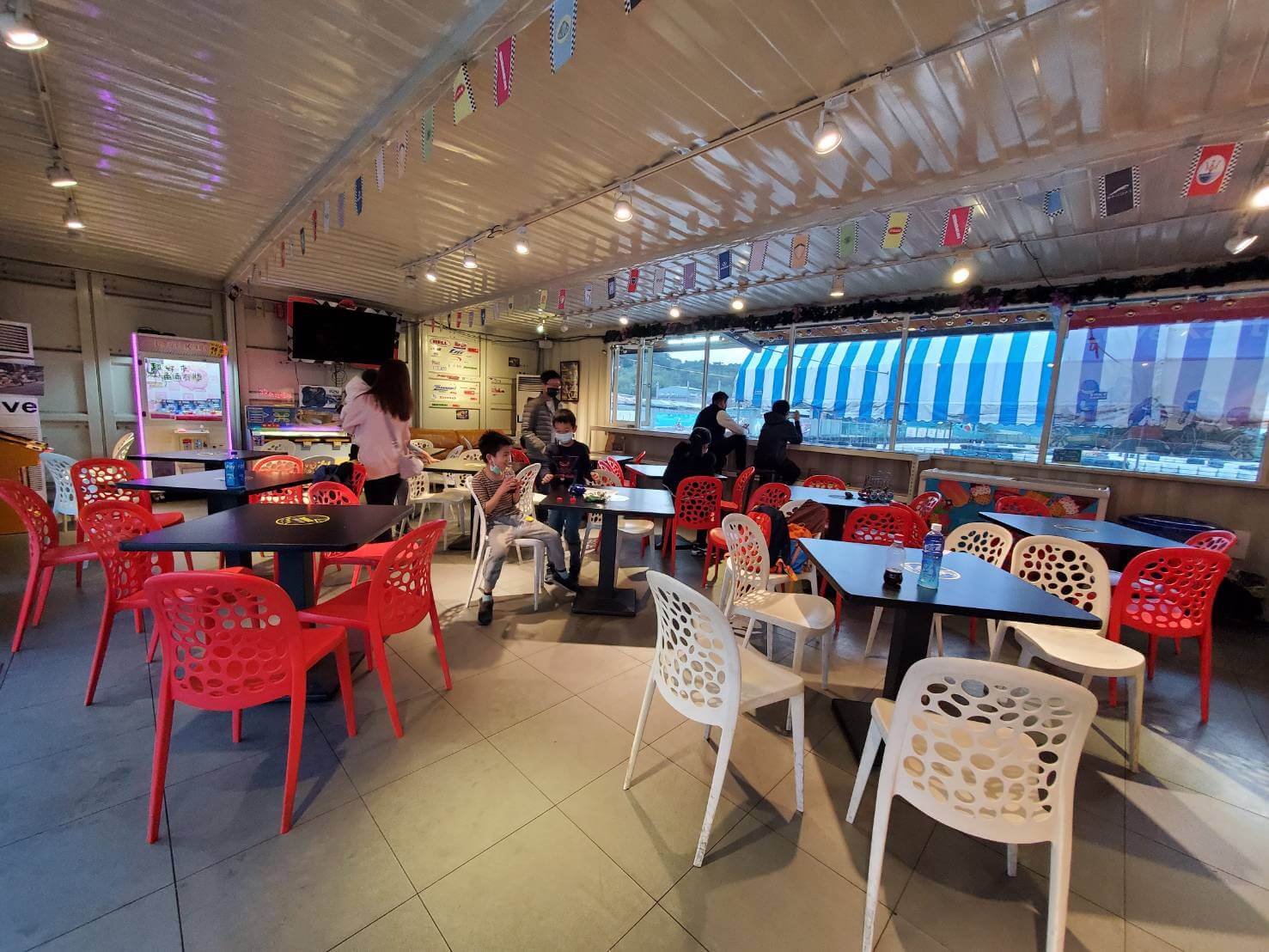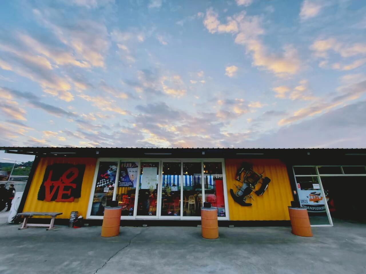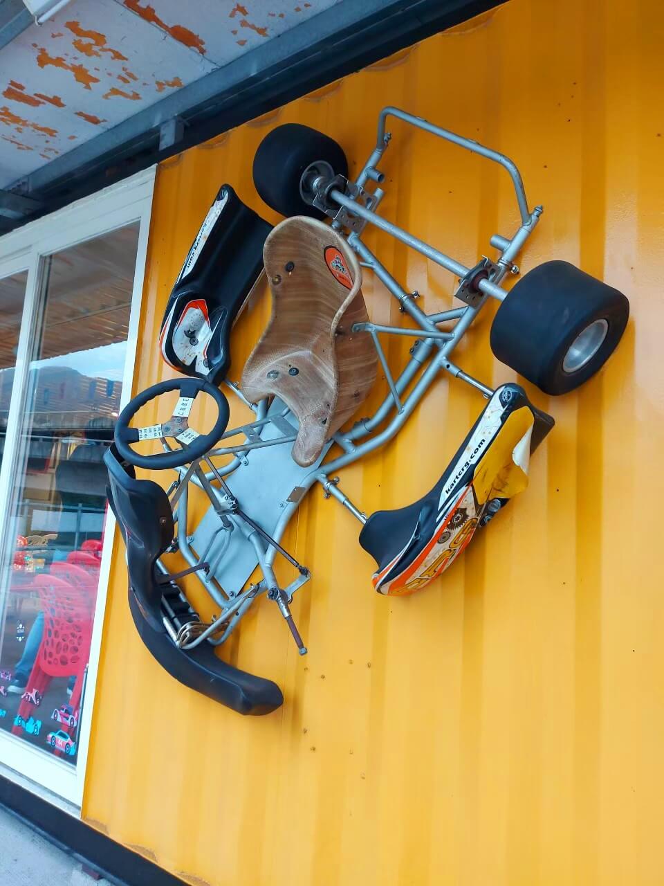 在停車場對面的黃色鐵皮貨櫃就是新北景點 樂福卡丁車的櫃檯和座位休息區,在鐵皮貨櫃牆上還黏了一台卡丁車的支架,超級吸睛