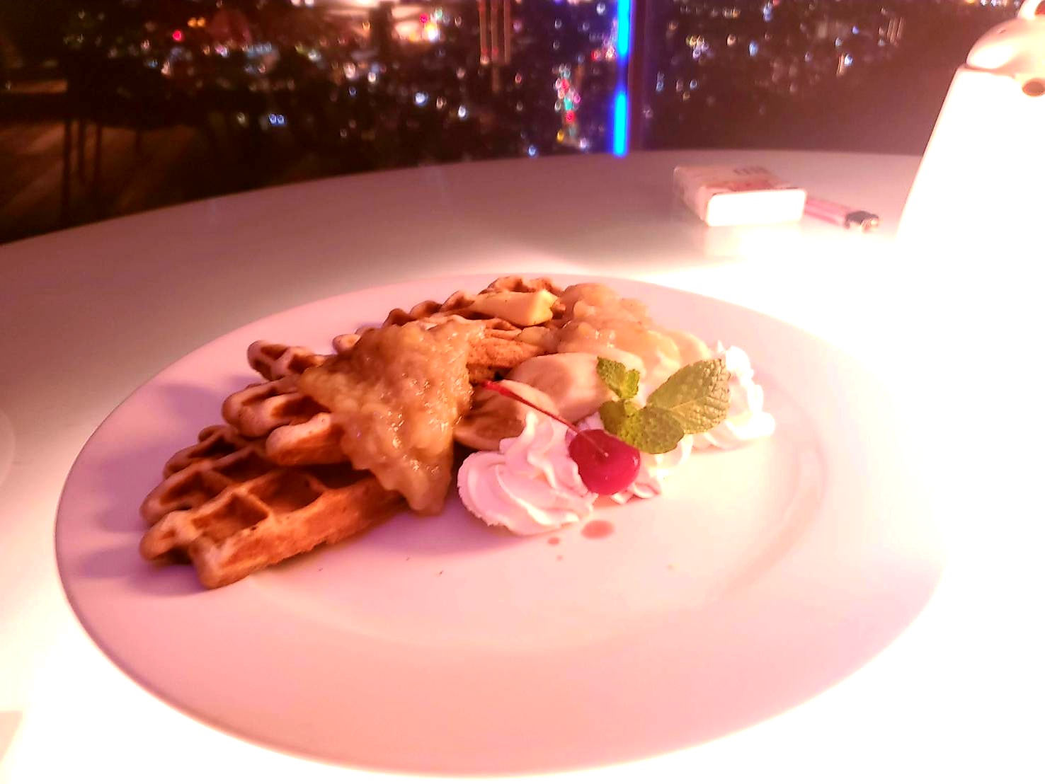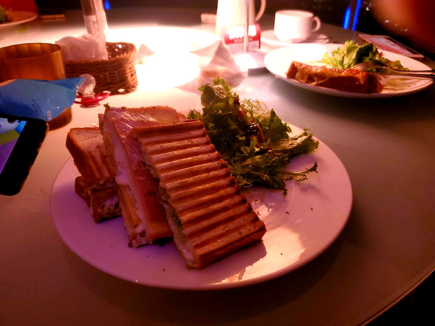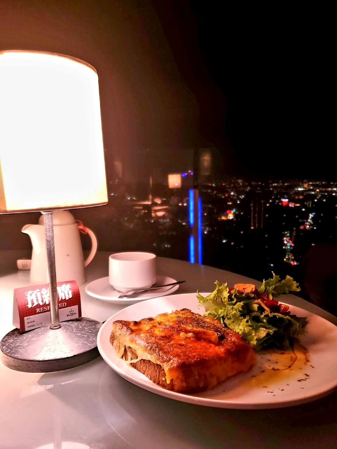 因為廚房在整修的關係,今天只提供輕食、飲品和調酒,原本預計要來這邊吃晚餐的我們,就各點了一份三明治、厚片和鬆餅,媽媽還點了一杯調酒,打算品著調酒欣賞夜景,也太愜意了吧