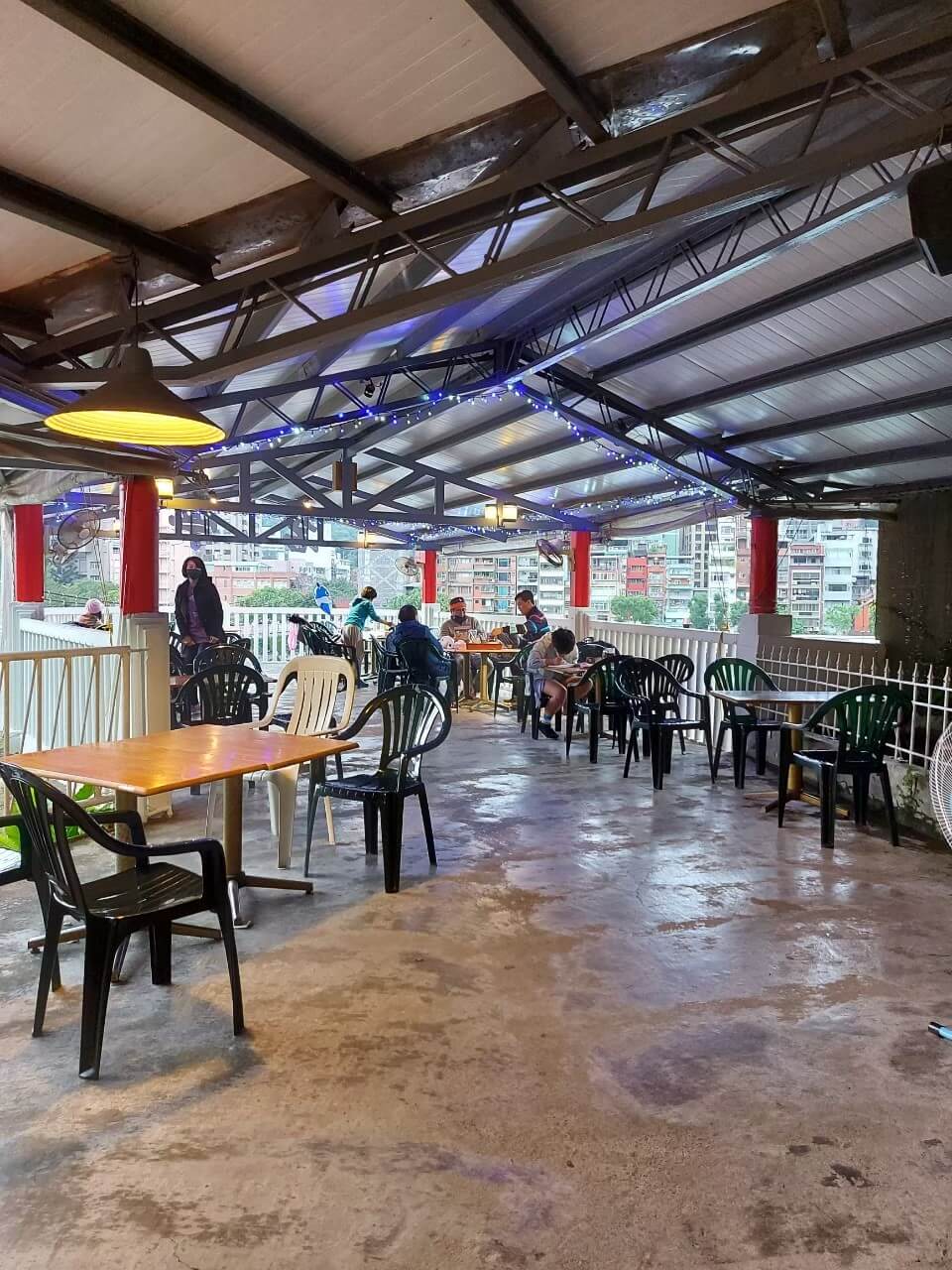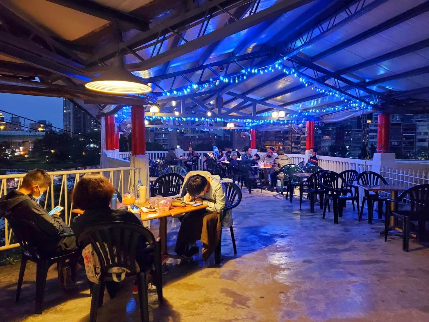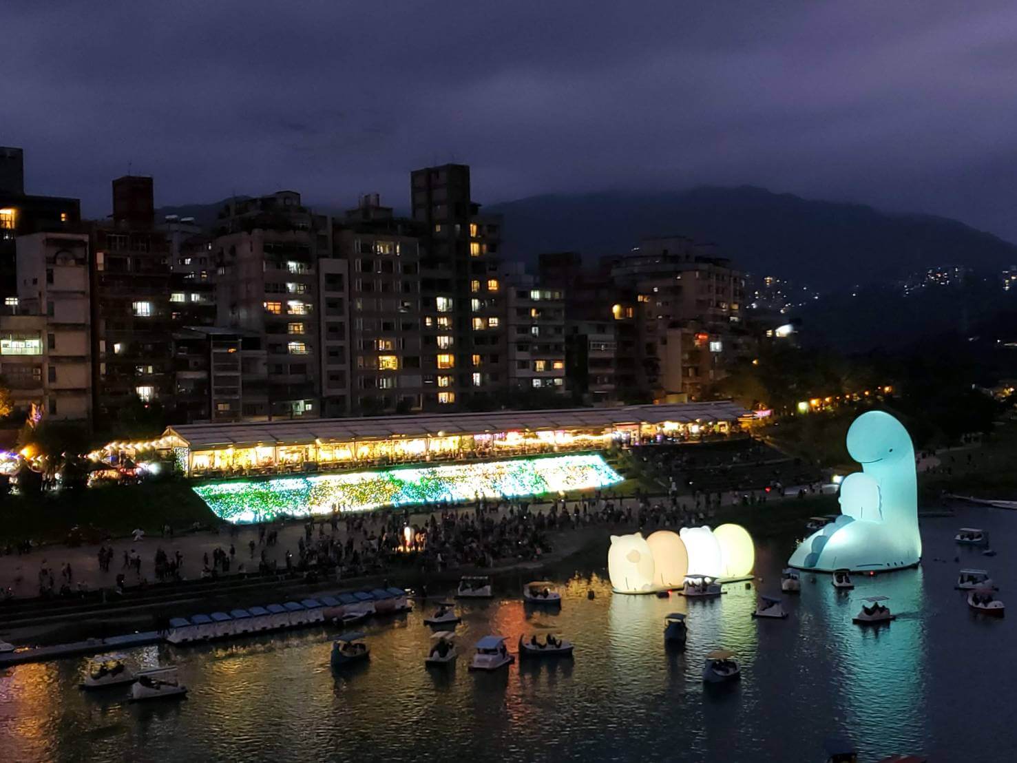 我們就這樣從天空還很亮的時候,一直坐到了天色整個暗下來,遠處碧潭的美食街和角落生物大氣球都點起了燈,只可惜今年沒有水舞秀可以看