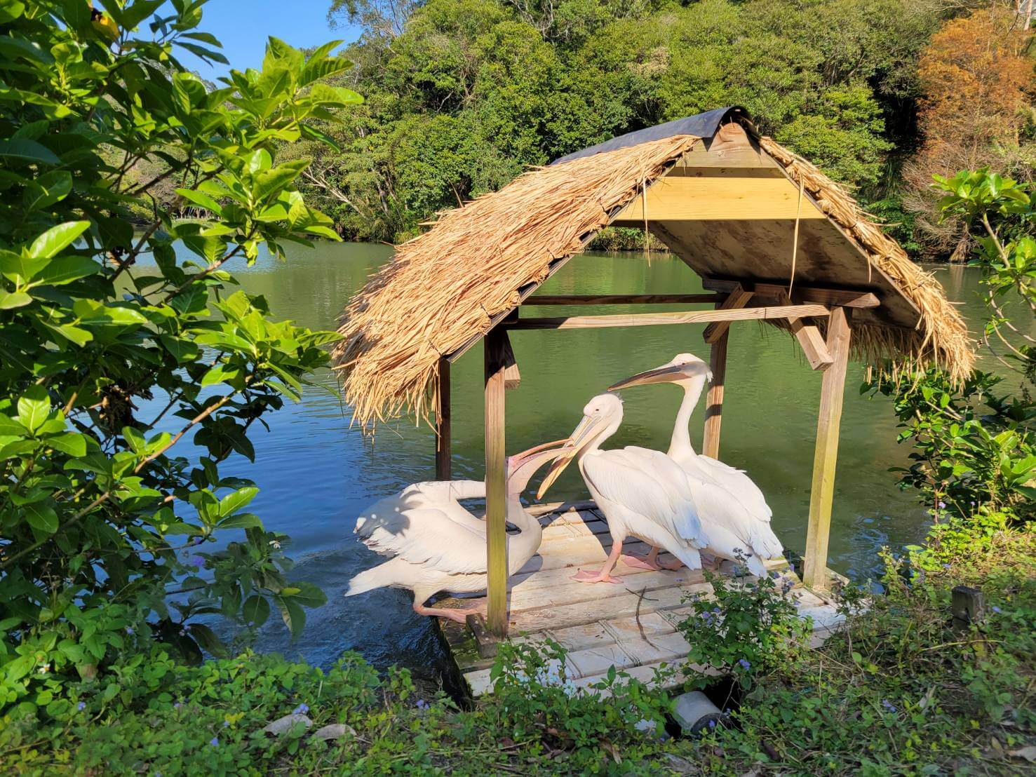 新竹景點 綠世界的園區很大很大,建議大家可以先拿園區地圖來看,從入口進來,先看到的是一片大湖泊,這裡可以透過望遠鏡看到各式各樣的鳥類,但是當天最吸睛的應該是完全不怕人的鵜鶘吧