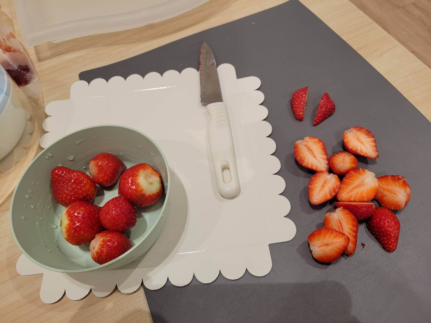 這一天在做甜點的時候還有發生一件趣事,媛媛是一個很喜歡吃草莓的小朋友,她一看到要放在草莓蛋糕上的草莓,雙眼直接發亮,拗不過她,我只好拿了2.3顆切小塊小塊的給她過過嘴癮