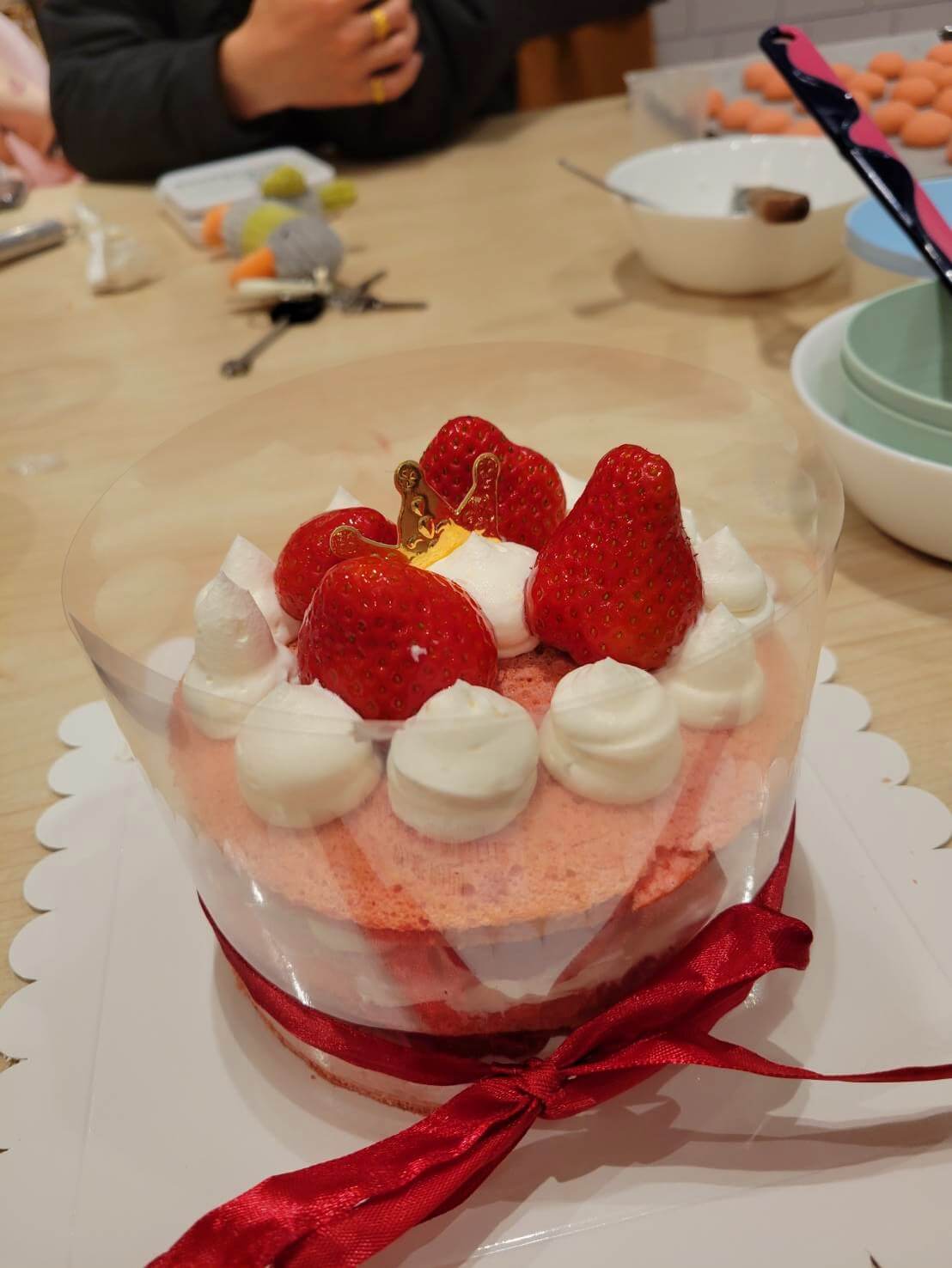 因為讓媛媛吃了幾顆草莓,我的草莓蛋糕上看起來比較寒酸一點,不過當作品完成的那一刻真的是信心爆棚,好喜歡可以自己手作甜點,希望下次排除萬難再回訪新北景點 home焙小日子的那天可以趕快到來