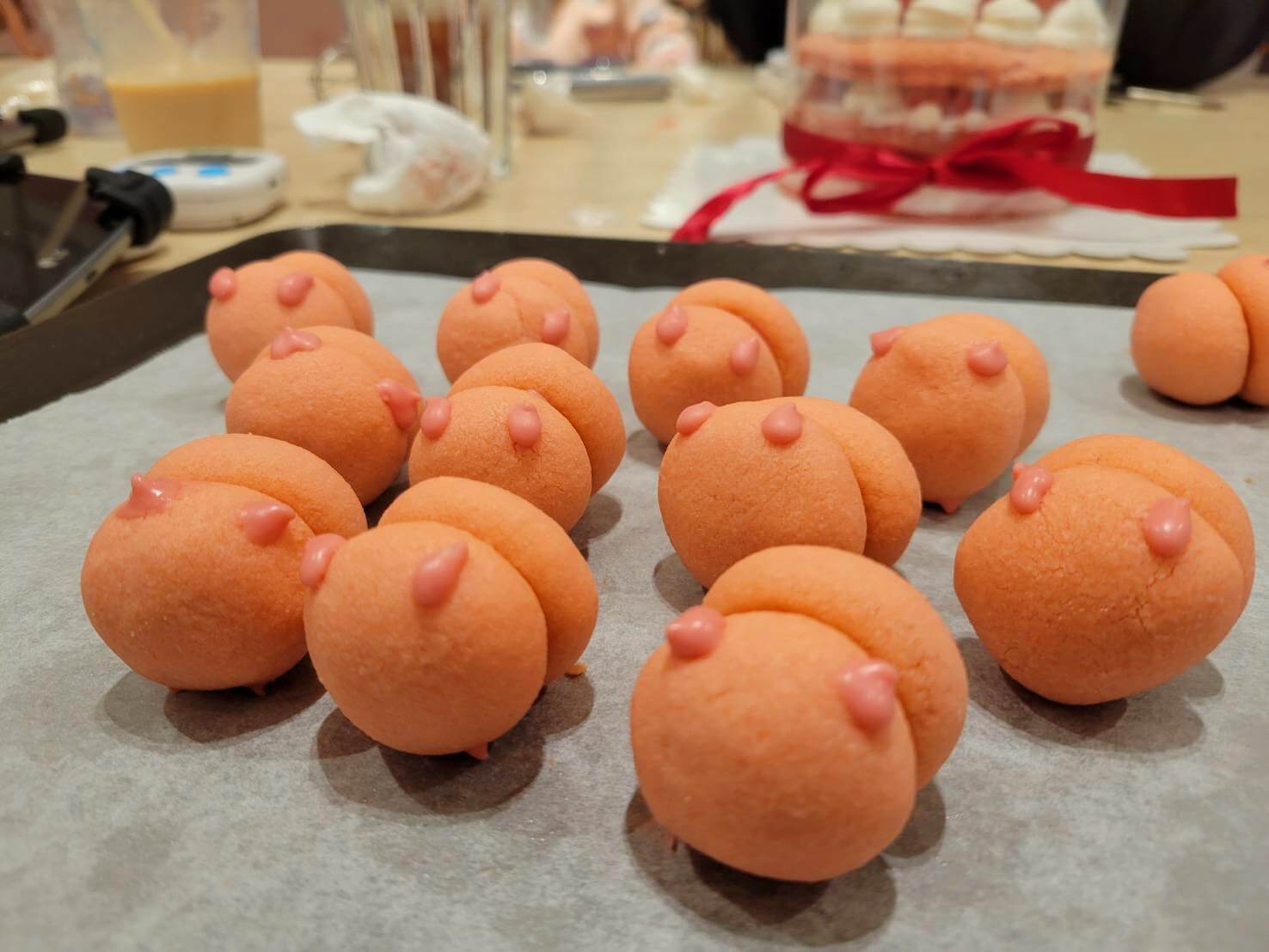 這次只有我和小伙伴還有媛媛過來,一樣是三個人頭,一樣要做兩份甜點,不過適逢草莓季,我選了一個草莓季的限定蛋糕和超可愛小豬餅乾