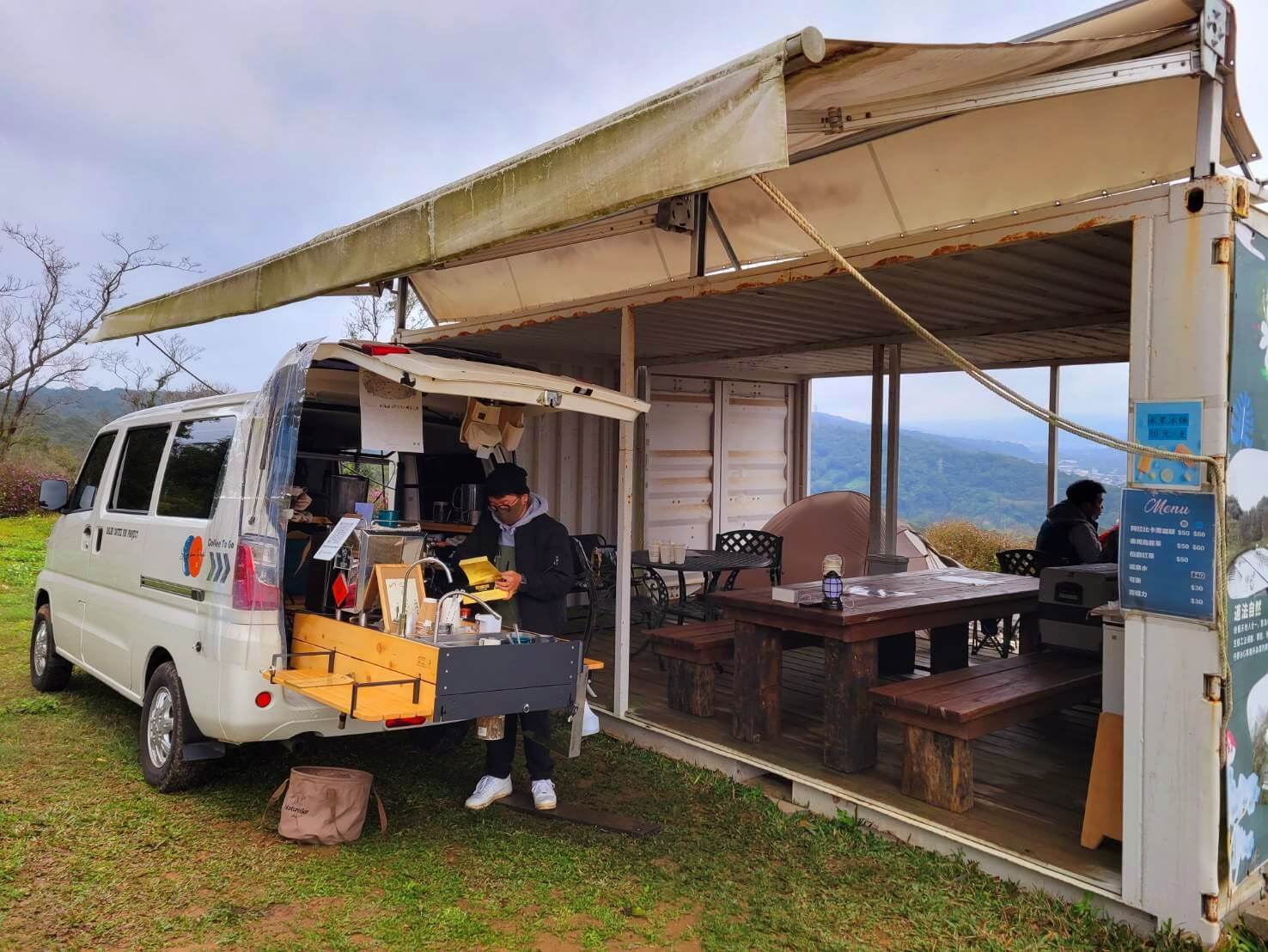 我們好不容易走到了頂端,這裡的視野是挺好的,在貨櫃屋旁邊有一台小卡車在販售咖啡,不過我們來的時機很不好,前一個客人把最後一杯咖啡買走了