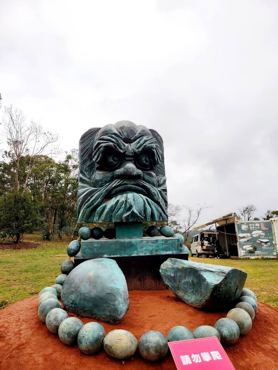 除了可以看山景以外,旁邊還有一個大型的達摩頭雕像,很突兀的佇立在草地上,也是新竹景點 雲夢山丘的一個拍照打卡點
