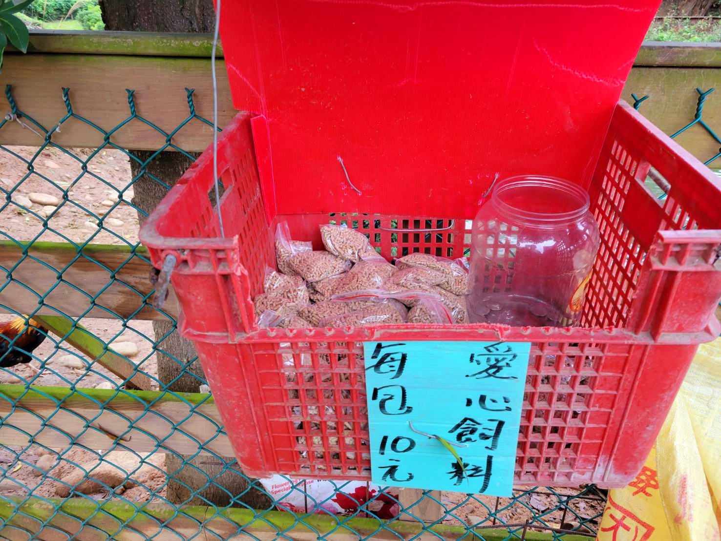 在百雀園旁邊有設置一個愛心飼料,是自己投錢自己拿的,一包才10塊錢,卻有一大包飼料,還蠻划算的