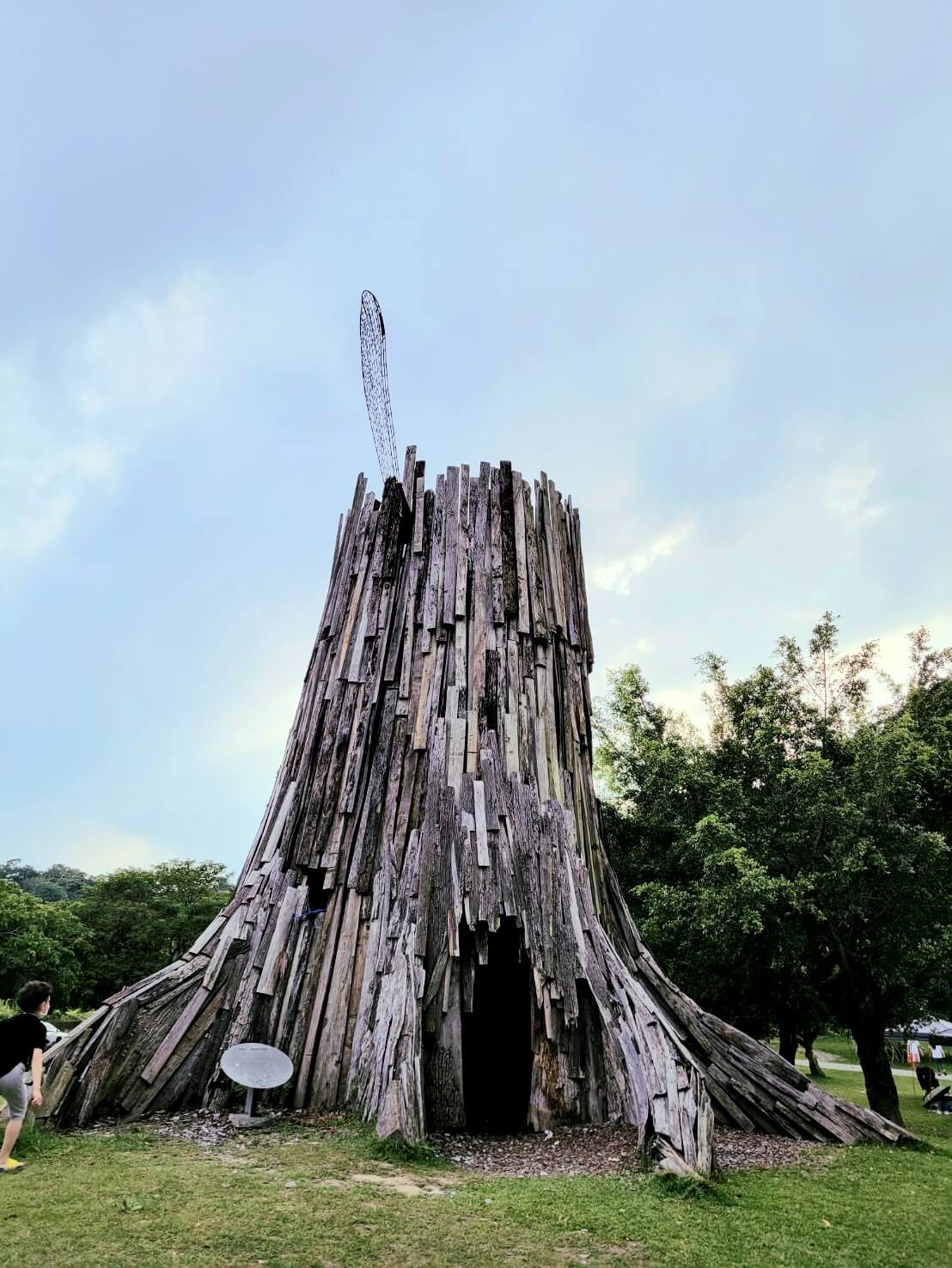 在草地旁,有一個大型的藝術裝置,是IG上蠻熱門的拍照打卡點之一,外觀看起來像是一個樹幹一樣,進到裡面最上方可以看到蜻蜓的翅膀,不知道是不是有什麼含義