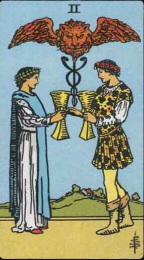 在萊德偉特塔羅牌中,聖杯二的畫面是一男一女面對而立,彼此手持聖杯,舉杯交換。