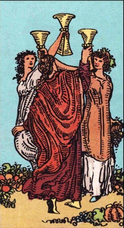 在萊德偉特塔羅牌中,聖杯三描繪了三位女性手持金杯,彼此舉杯慶祝,腳步輕盈,臉上掛著笑容。