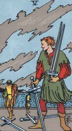 在萊德偉特塔羅牌中,寶劍五畫面上有一位神情得意的人,手裡拿著三把寶劍,身後則是兩位低頭離去的角色。