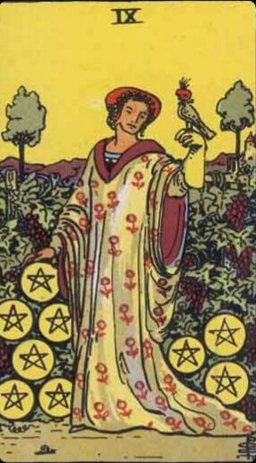 在萊德偉特塔羅牌中,錢幣九描繪了一位穿著華麗的女性,站立在葡萄園中,四周環繞著九個錢幣。