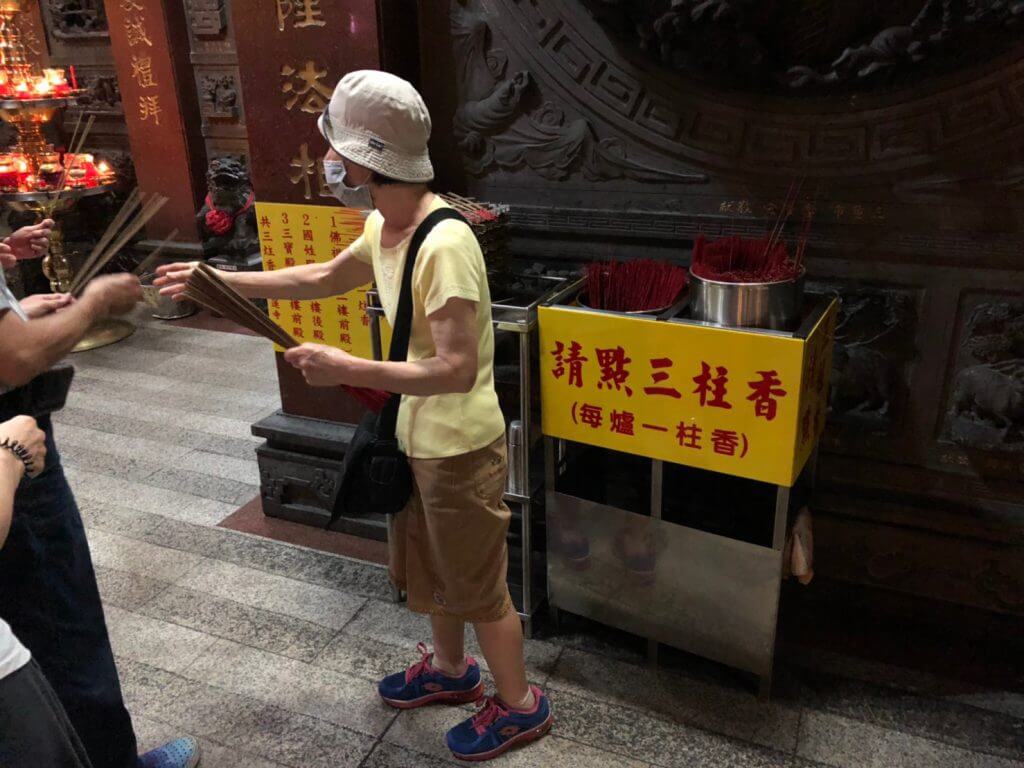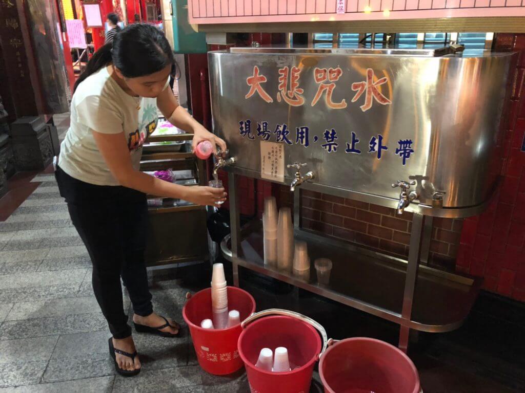 爬上湧蓮寺高聳的樓梯後,在入口旁有設立大悲咒的水供大家免費取用,而為了因應環保政策,湧蓮寺從好幾柱香,縮減為現在的3柱香,當天我們來的時候還有看到有人專門在發放香給香客~