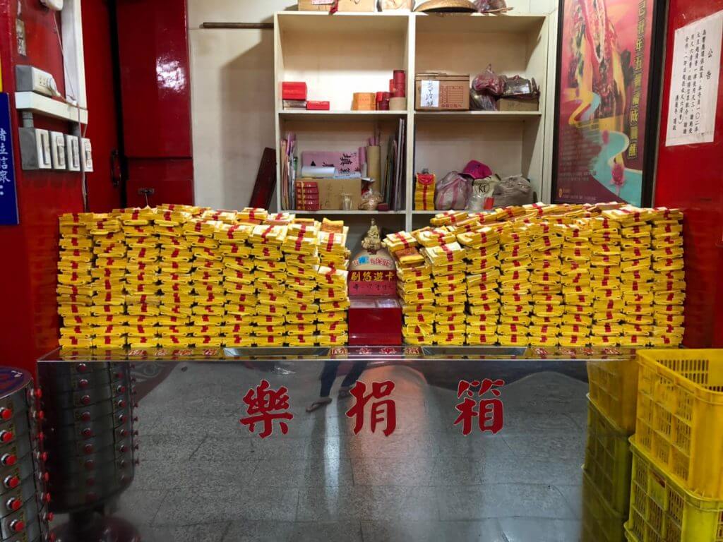 而在2樓的前殿旁邊,有提供洗淨亭和盤子給信徒們洗淨供品及提供容器,在洗淨亭旁就是湧蓮寺燒金紙的地方,在金亭的旁邊有放置一個袋子跟箱子,大家燒金紙時,也要記得分類好哦