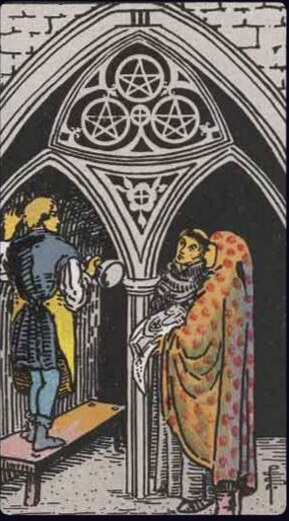 塔羅牌 錢幣三像一位專注的工匠,與兩位同伴在高聳的教堂下討論藍圖。