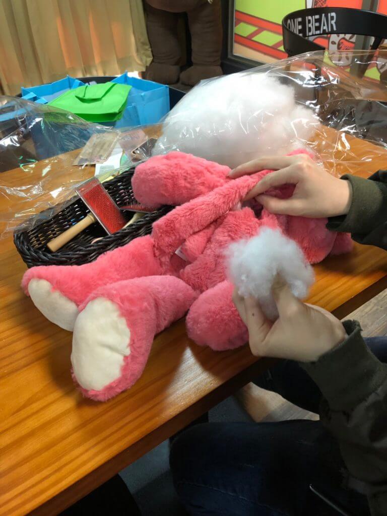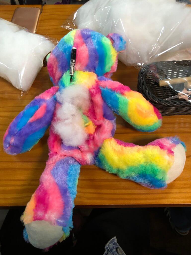 在塞棉花的時候,要注意他的線不可以一起被塞進去,不然最後結尾的時候,你的小熊可是會有縫隙的。還沒被棉花撐起來的小熊躺在桌上的畫面看起來實在很好笑哈哈哈
