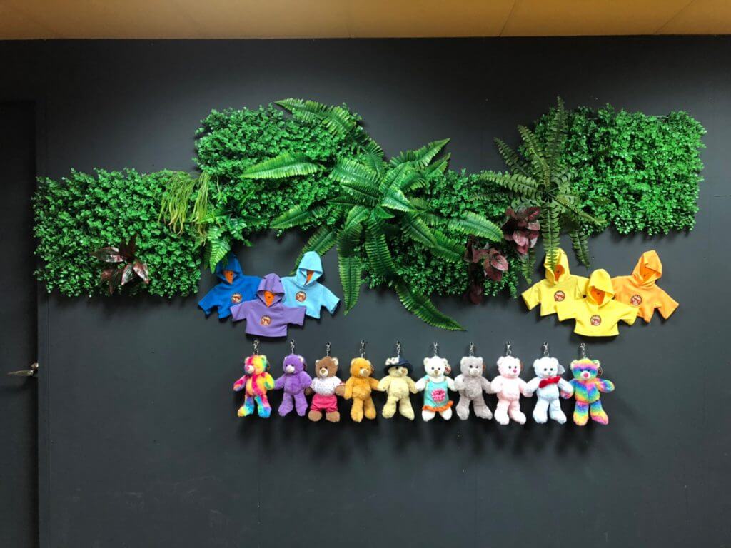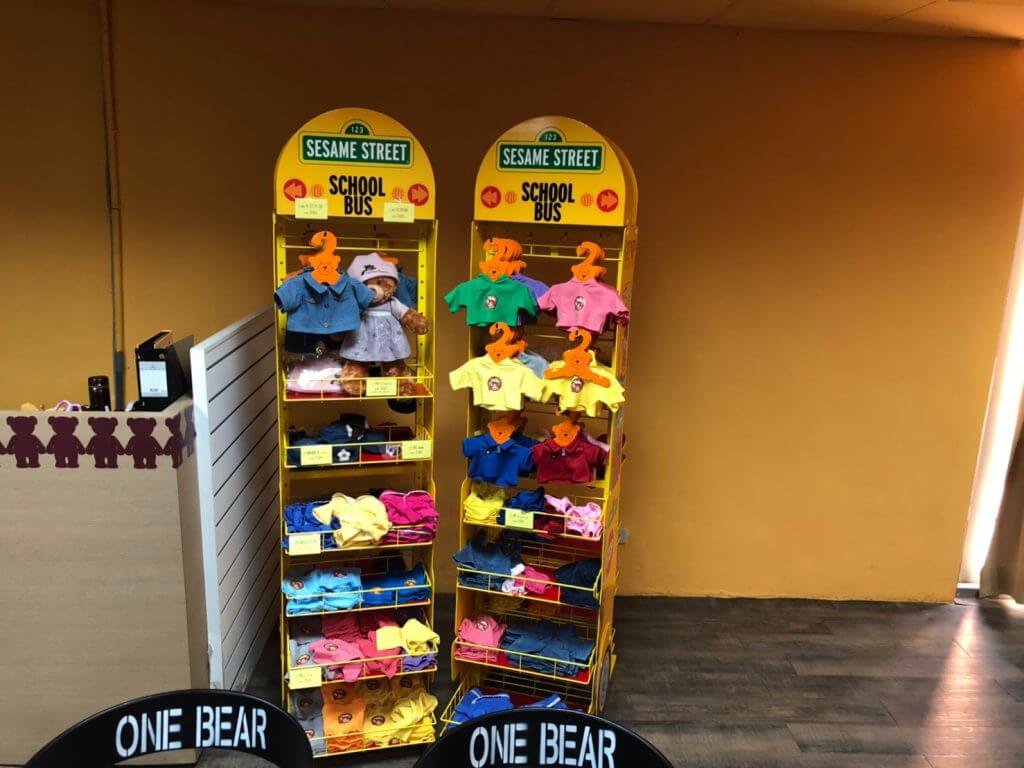 在DIY教室裡,有其他顏色小熊的展示,還有小熊的衣服可以幫它們搭配購買,像小伙伴就覺得他的小熊大小眼,就幫他買了一副墨鏡,而妹妹則是幫他的小熊選了一件吊帶褲,媽媽則是幫他的小熊鑰匙圈選了一頂帽子,穿上衣服的小熊看起來是不是更可愛了呢
