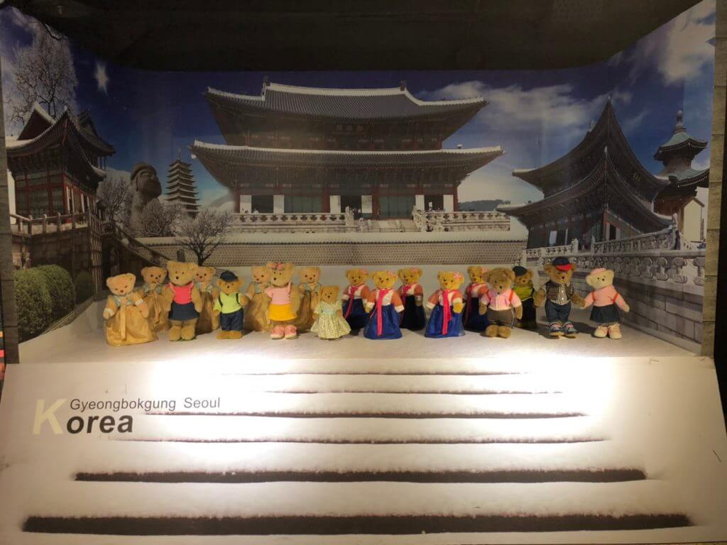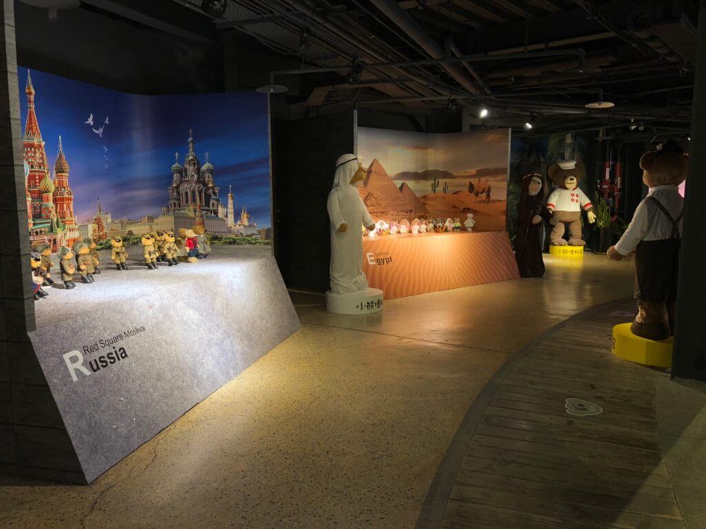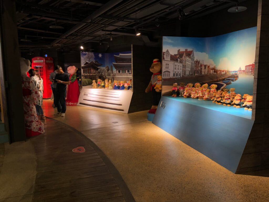 1樓的主題是世界各國的小熊,一群群不同國家風格的小熊站在一起,在放入自己的小熊,一秒讓它環遊世界。而小熊堆裡偶爾還會有一些小巧思喔,像在韓國,則有一對小熊情侶牽著手,而在義大利則有一隻穿著裙子的小熊姿勢特別嫵媚,在照片中有發現它的身影嗎