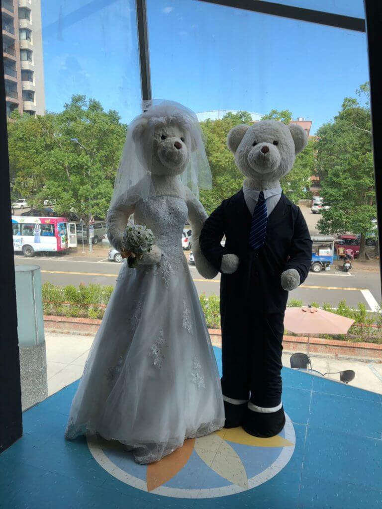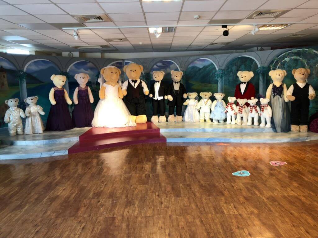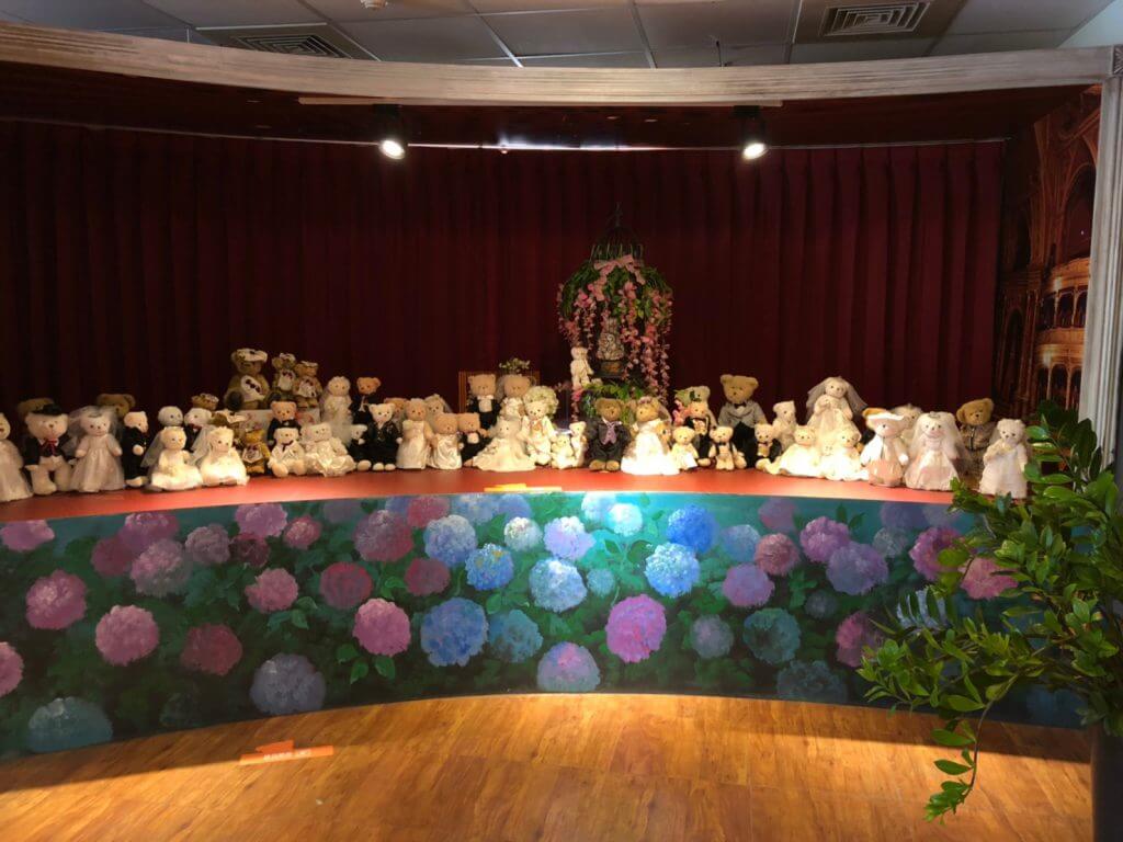 而在二樓裡面還有一個展間,那就是:婚禮區,一進去就是一整排的小熊迎接我們,有新娘新郎兩個主角站在中間,一旁還有伴娘伴郎及賓客,每一個都穿禮服和西裝