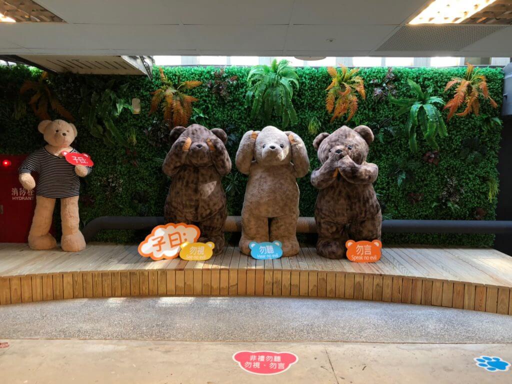 我們到了B1之後,展示的小熊並不多,都是一些不同風格的小熊,最可愛的是還有「非禮勿視,非禮勿聽,非禮勿言」,這三隻小熊還有搭配各自的動作,和它們擺著同樣的動作拍出來的照片也別有一番風味呢