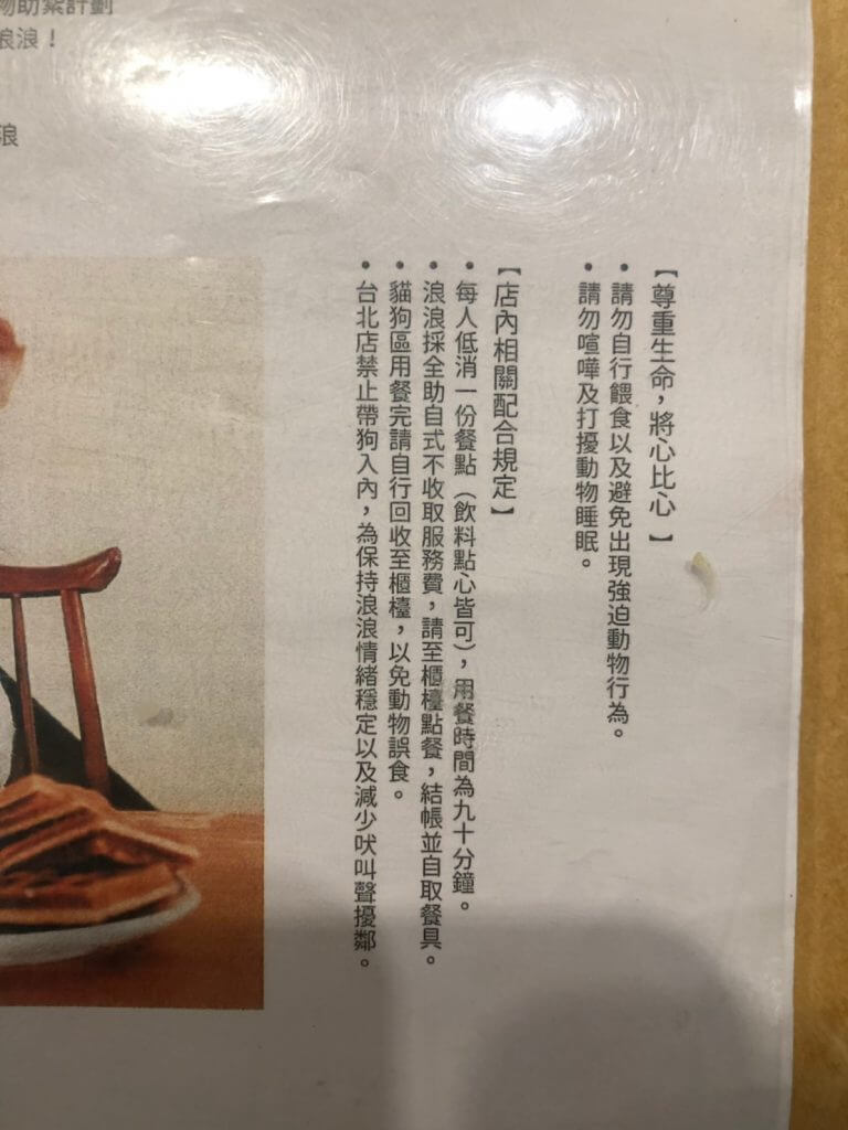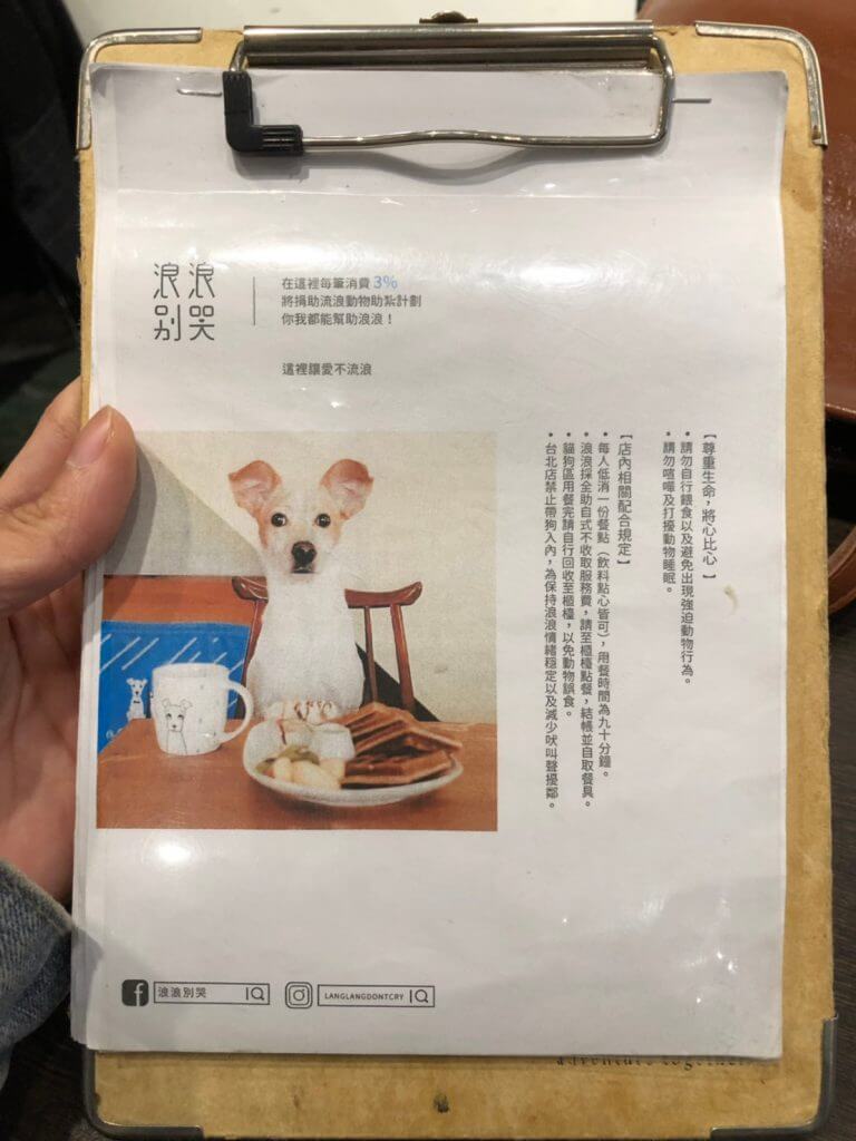 入座以後,桌上都會有菜單,在菜單的前兩頁都是一些注意事項,在看菜單前,記得要先將注意事項全部看過一遍才可以喲,而菜單上則還有註明:在這裡每筆消費的3%將捐助流浪動物結紮計畫,讓我們在消費的同時還能盡一份力幫助流浪動物