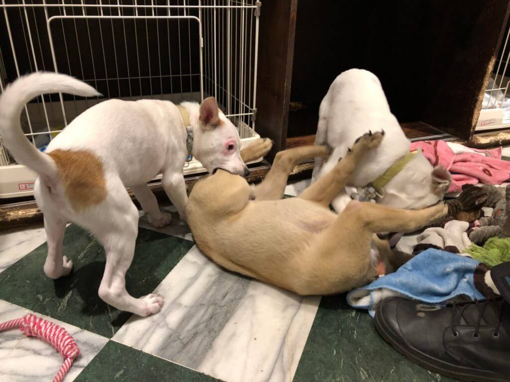 我和小伙伴在吃飯的時候,兩個人的目光則是跟著小狗狗們跑來跑去,三隻小狗狗精神特別好,在店裡跑來跑去追逐彼此,時不時又將對方壓在地上欺負,後來或許是玩開了,邊玩耍邊汪汪叫,後來服務人員只能拿起飼料吸引牠們的目光