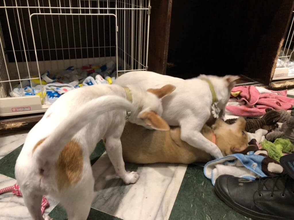 等大家手上的食物都餵食完以後,小狗狗們又很有默契的開始牠們的追逐戰,而這一次連大狗狗都一起加入這場戰爭,整間店就看到狗狗跑來跑去,而他們最喜歡的地方則是旁邊的沙發區,小狗狗們時不時就會躲在沙發下,而大狗狗太大隻就只能在外面徘徊