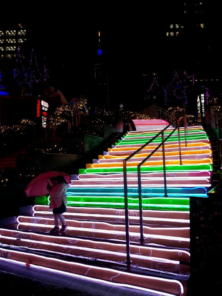 有別於一般較保守的燈光,統一時代廣場運用了各種不同的螢光色打造了一個彩虹階梯,就連位在二樓的星巴克都一起參與了這場裝飾,光是在這個樓梯前就可以按下不少快門了哈哈,只是當天很可惜,後方的101已經沒有點燈了,不然這個畫面一定更美