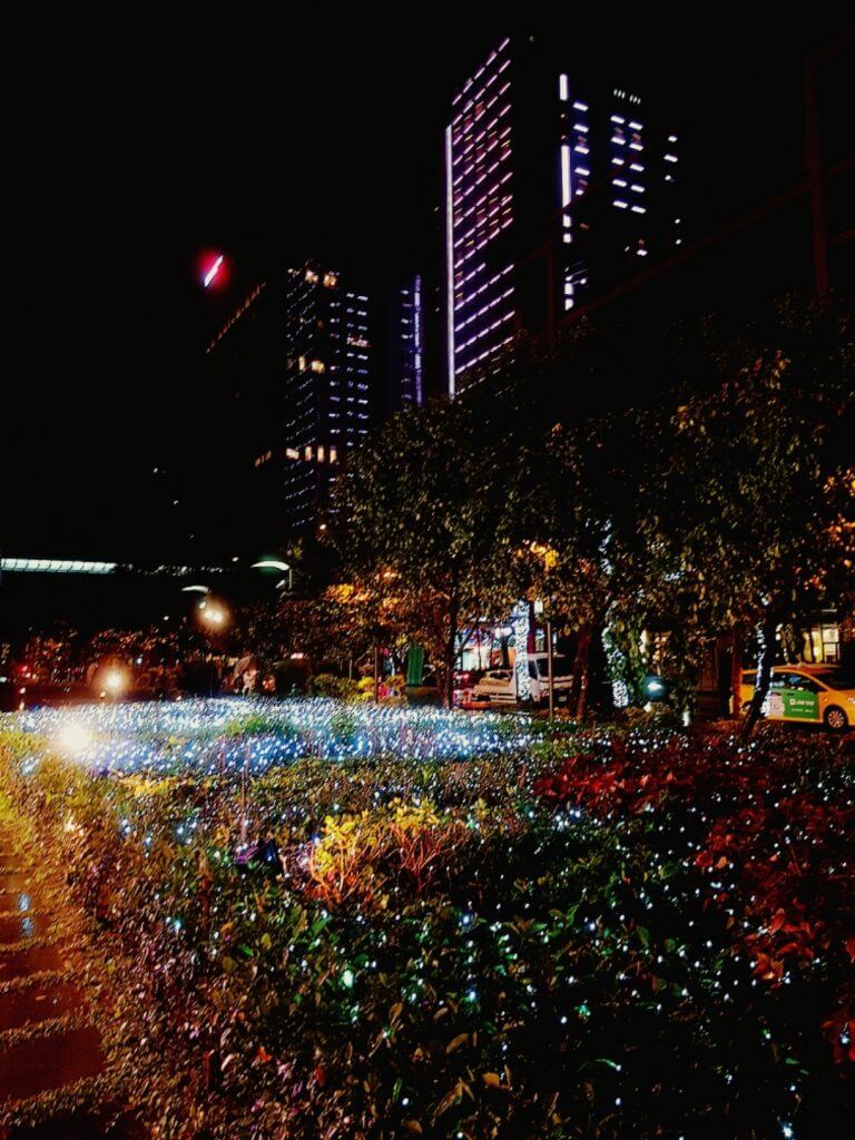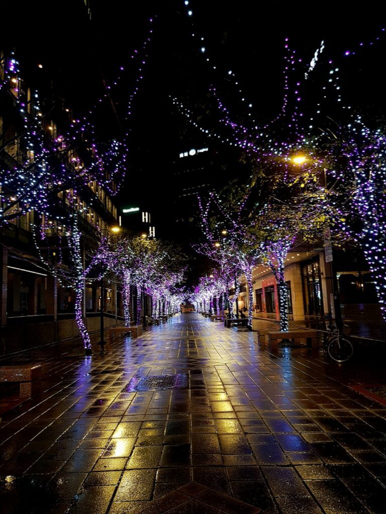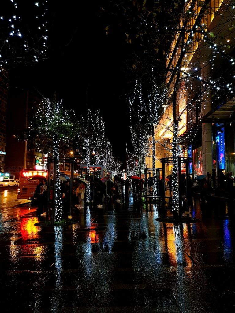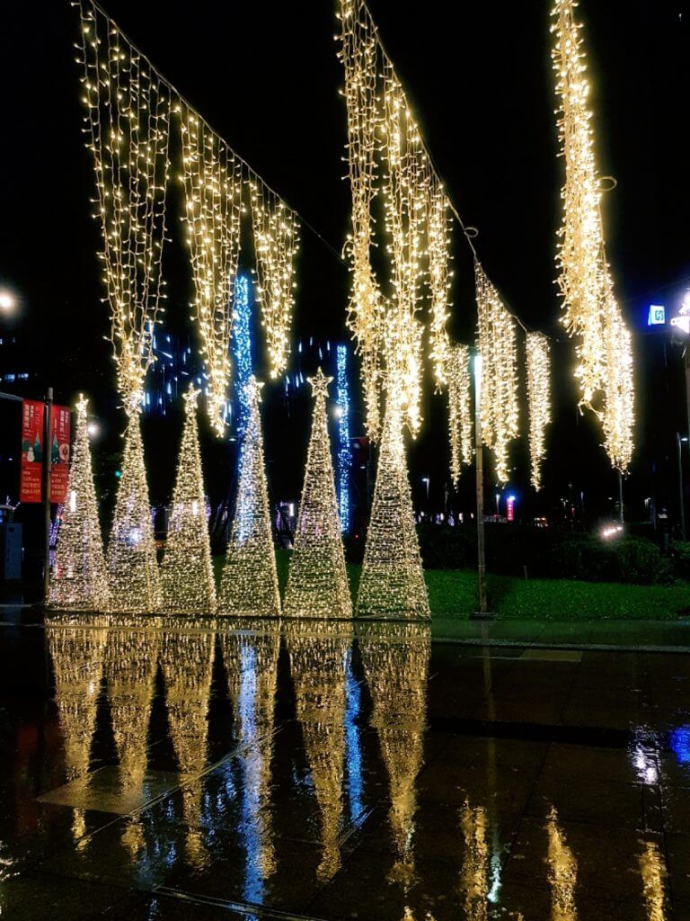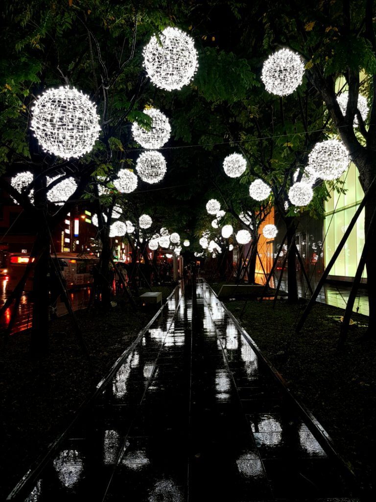 其實一路上,只要是人行道可以裝飾的地方,都一定會掛上小燈泡,只是顏色不一樣而已,也因為下過雨,地上溼答答的,也反射出樹上的燈光,反而有另外一種感覺呢~
