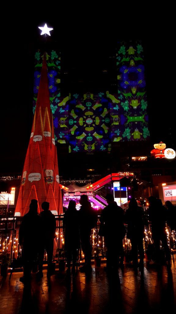 在活動的正中間,有一個像竹筍聖誕樹,每到半點和整點的時候,都會開始點燈,只是今年我們沒有多停留,也就沒有看到了,不過前幾年的我則是有拍照,下面放的聖誕樹並不是今年的哦