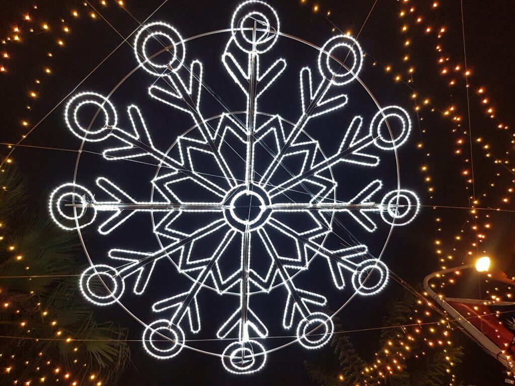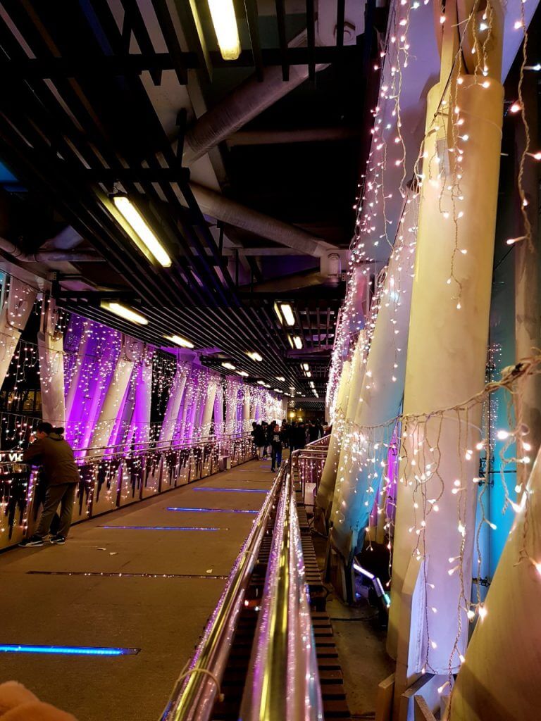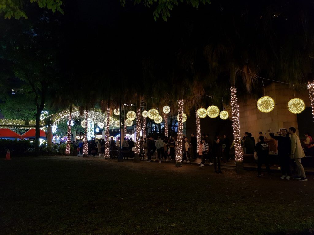 有些是在樹上掛上了一顆顆的光球,有些則是只繞上了小燈泡,而最不一樣的是靠近主會場的人行道,抬頭往上看,可以看到一大片的雪花在你的正上方,這也是不同於以往的小巧思呢