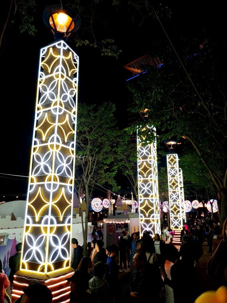 看了這麼多的耶誕城裝飾,其實不難發現每一年都有一個主題燈色,我猜今年應該是以黃色為主體,因為不論是人行道的裝飾又或者一旁的柱子,甚至是遊樂設施,都是以黃白配色為主,看起來真的是美美的啊 ~