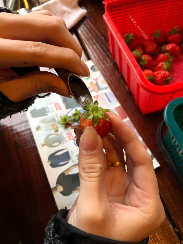 一開始先把草莓的蒂頭去掉,記得不能留下來綠綠的地方,也不能挖掉太多的果肉,不然最後的草莓醬可能就沒有這麼多了