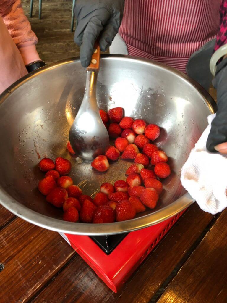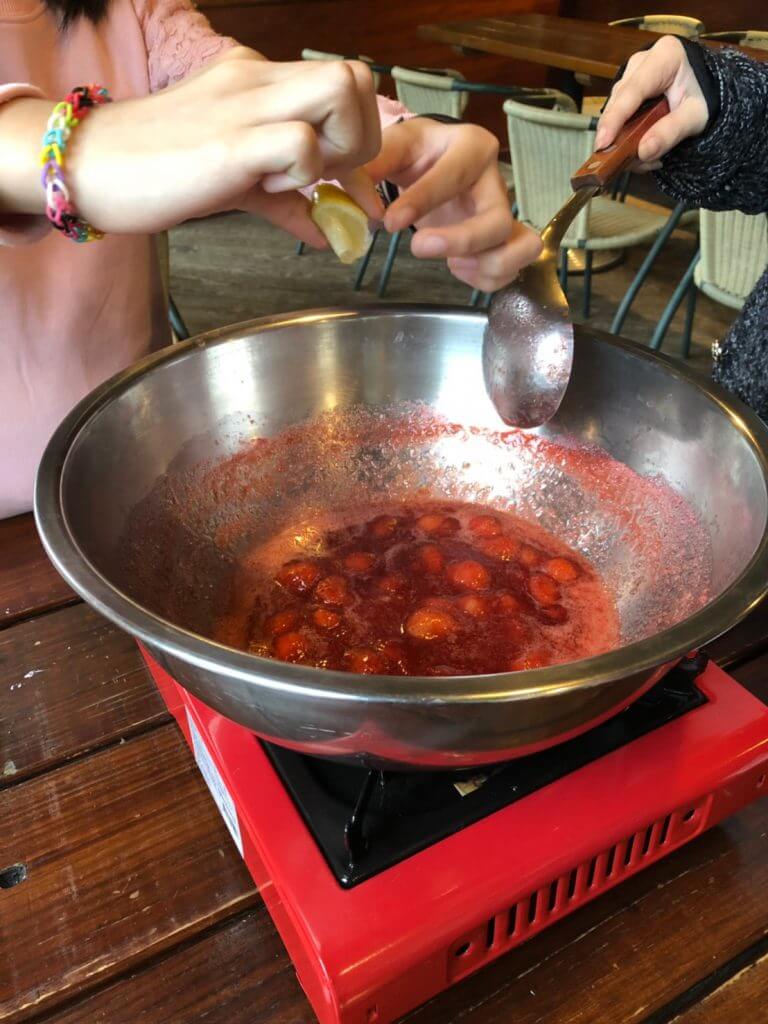將去掉蒂頭的草莓們丟入卡式爐上的鍋子,接著開火加熱並且持續攪拌,我們要一直攪拌到草莓煮出膠質來,如果停下攪拌的話鍋底可以會燒焦的,如果手酸了記得趕快讓同伙的接手哦