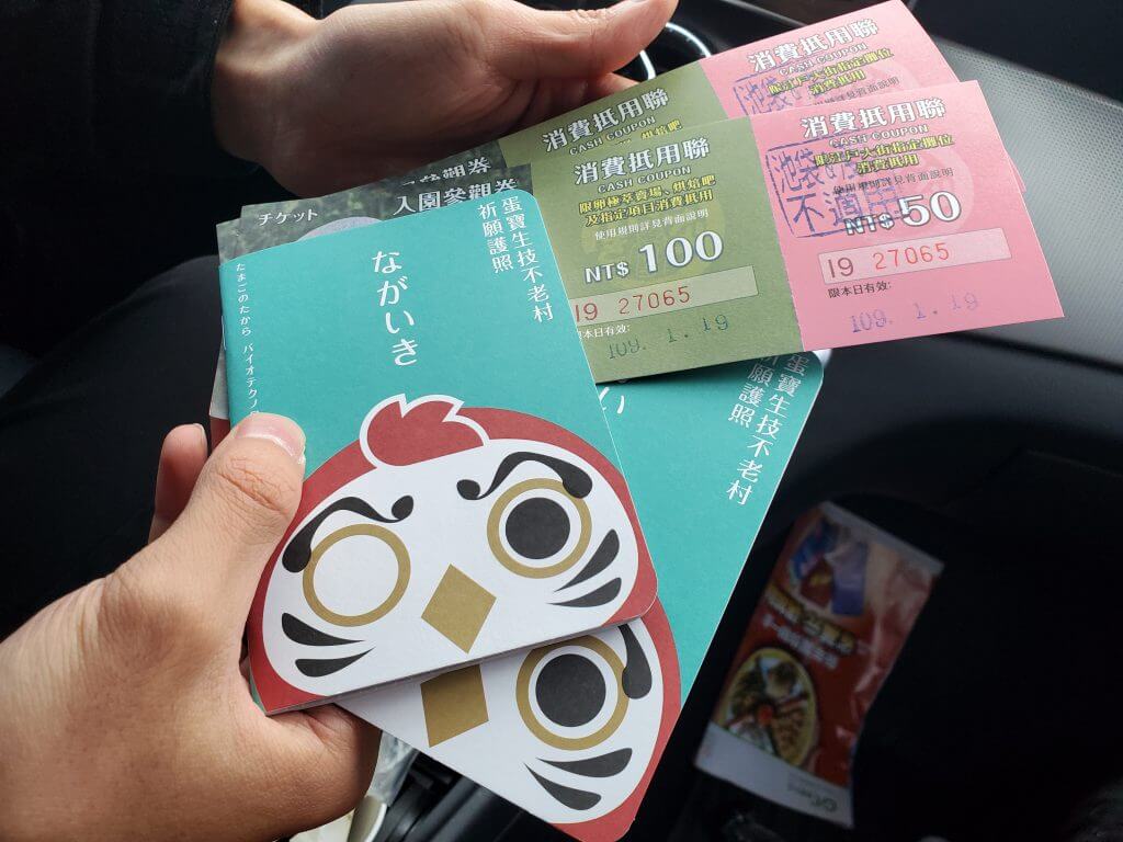 我們一開車要進停車場的時候,就有工作人員先來和我們收取門票費用,一個人150元,可以全額折抵消費,不過倒是有分粉紅券跟綠色券,分別是在不同地方才可以折抵,除了門票以外,還給了一本祈願護照,封面是不倒翁圖案的,很可愛呢~