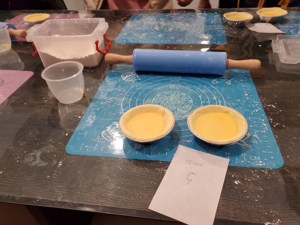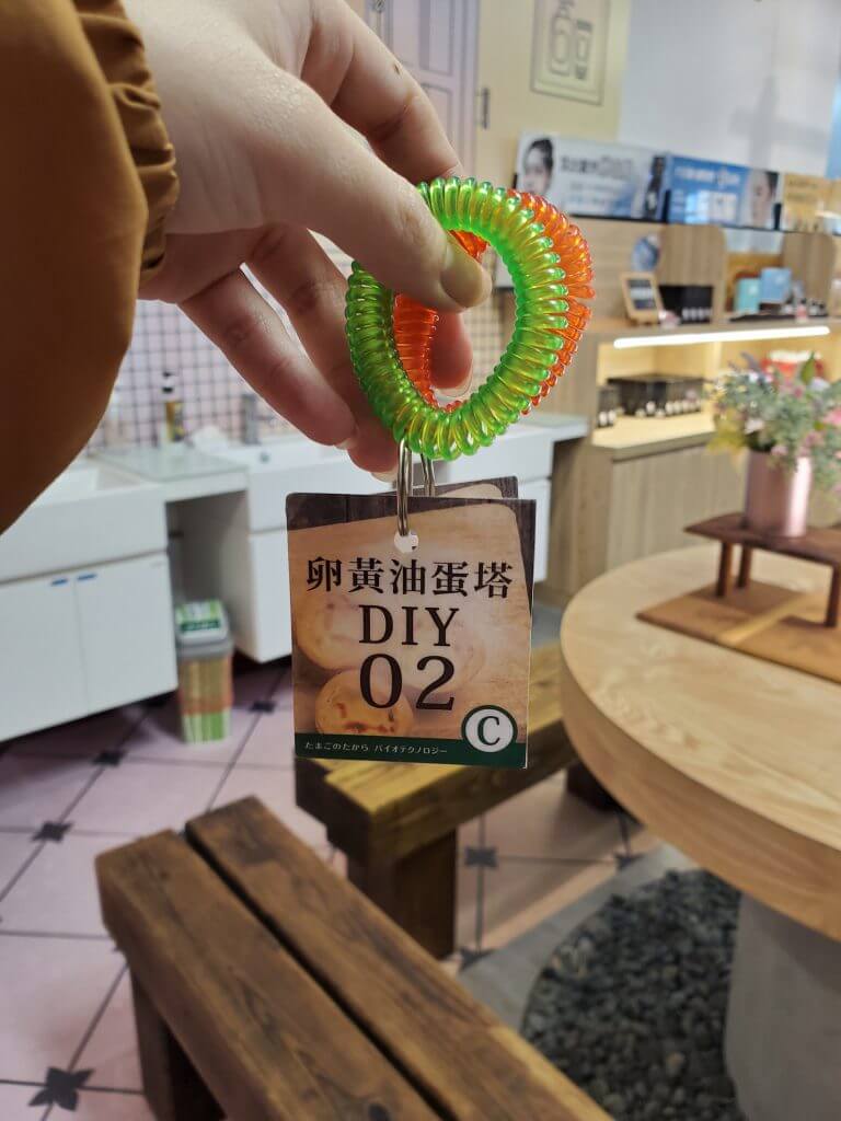 將卵黃油製成的蛋塔餡倒入餅皮內以後,DIY老師會一人發一張號碼牌,要記得自己的號碼,30分鐘後就可以和櫃檯的工作人員領取烤好的蛋塔啦~