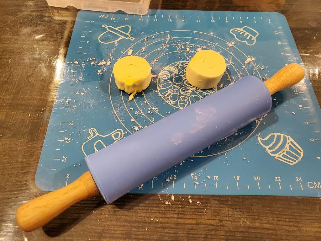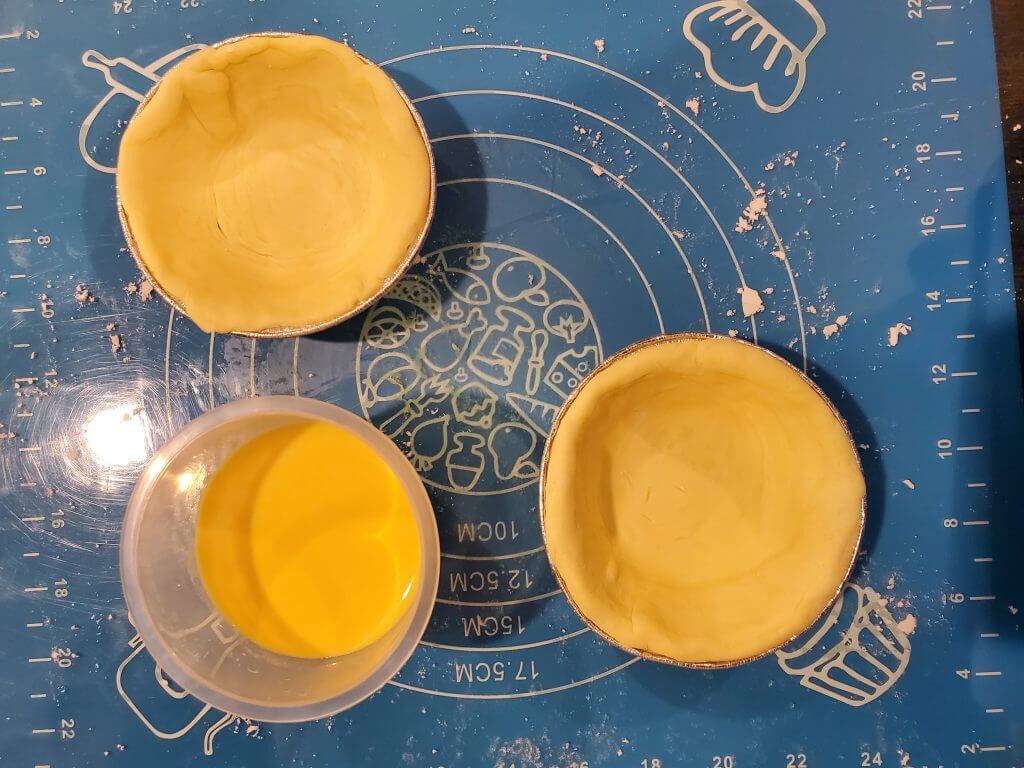兩個已經做好的蛋塔塔皮,捲起來的樣子就像是年輪,根據DIY老師說的,這樣子的塔皮吃起來才會有酥酥的層次感,使用擀麵棍將塔皮擀開,直徑只需要10公分,再將擀開的塔皮放進我們蛋塔的容器裡,這樣子塔皮就完成啦 !!