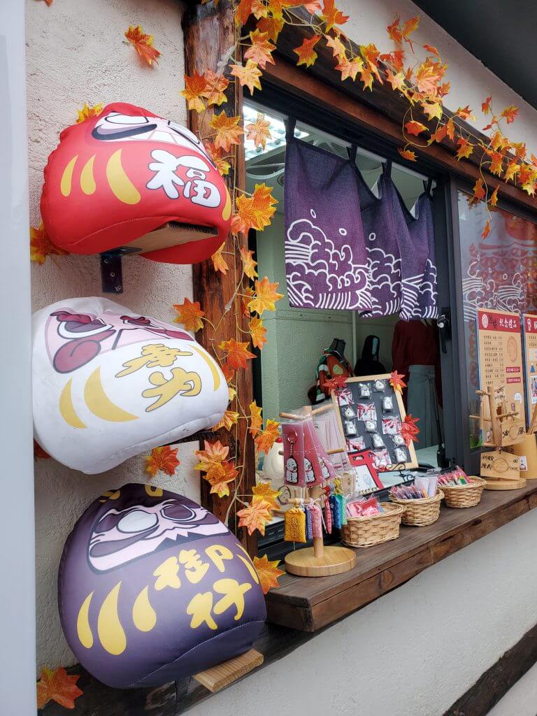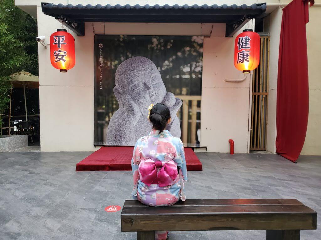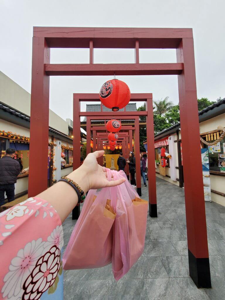 換上和服以後,走在外面的「江戶大街」上,彷彿就像是置身在真正的日本一樣,除了一整排的紅色的島居外,還有紅藍色的布幕,在各個角落都特意打造成日本的樣子,尤其是在大門口這個角落,竹子配上長椅穿上和服坐在這拍張照,一張網美照就這樣誕生了