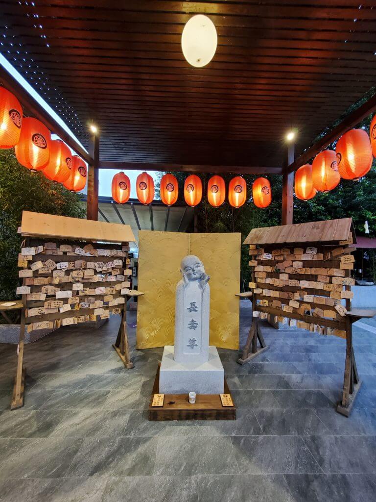 在島居的最後面,有一尊「長壽尊」,我們在參觀的時候剛好有聽到導覽員說:長壽尊在世界上只有兩尊,一尊就是在日本,另一尊就是在蛋寶生技不老村裡,而且這裡的長壽尊是有「開光」過的,是真的可以參拜的哦