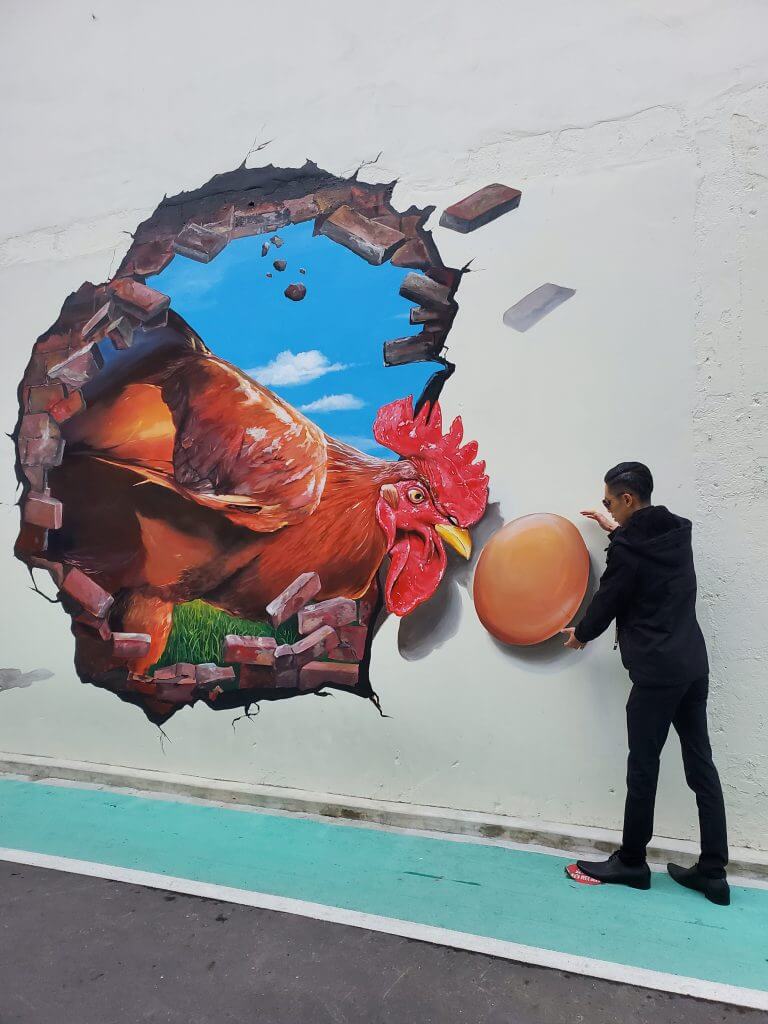 在蛋寶生技不老村的另一個方向,則是有幾幅一大面的立體畫,角度抓的好,就好像是3D的圖案一樣,有和公雞搶雞蛋的,也有一大束的氣球,只是當天有遇到一群年輕人在氣球的點前面拍照拍的有點久,我和小伙伴晚一點還有其他事情,就只能作罷了