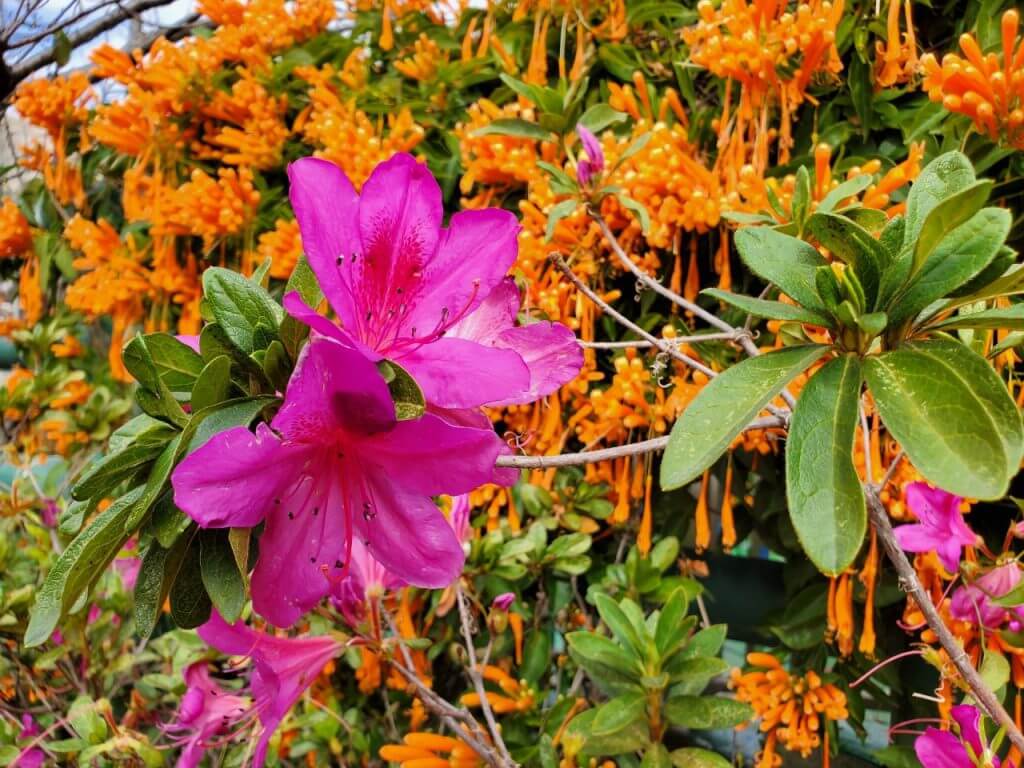 不過亮橘色的炮仗花配上綠葉的襯托,彷彿就好像一副油畫一般,色彩鮮明繽紛,再加上當天天氣很好,藍天白雲,難怪有不少人起了大早也要來到這裡和炮仗花留下合影