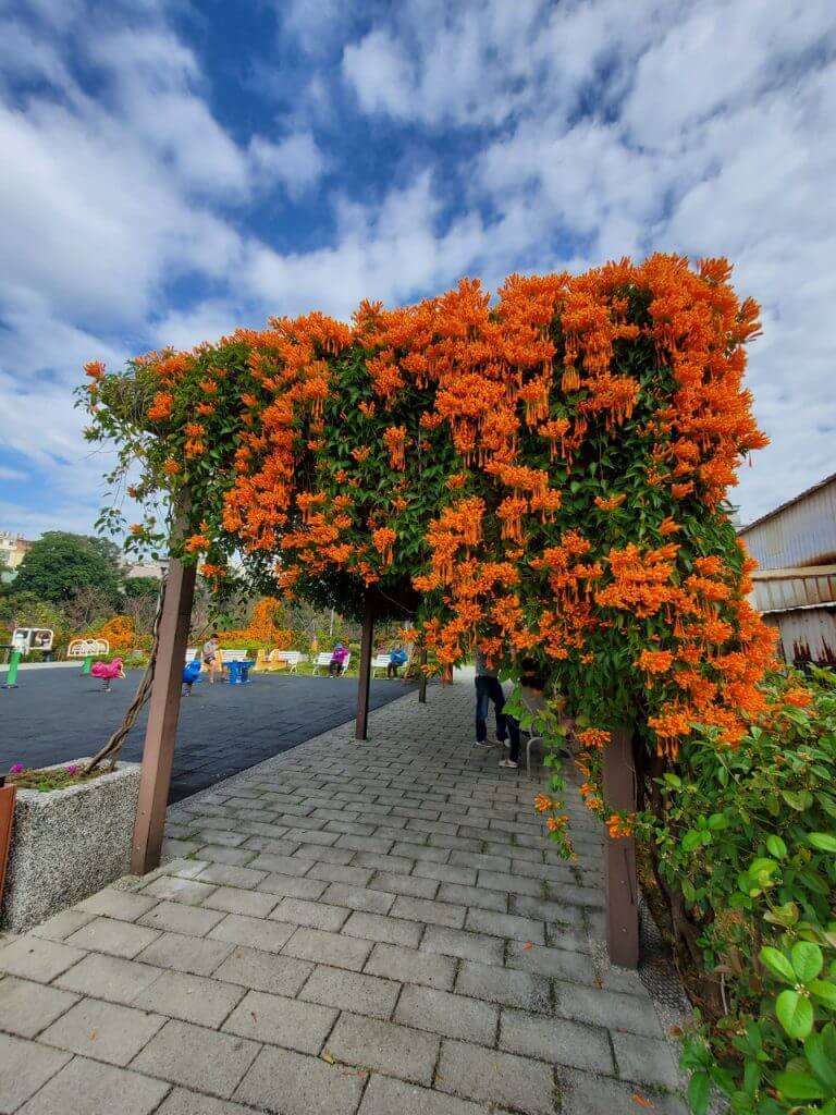 而在往裡面走一點,就能夠看到現在的正值花季的主角-炮仗花,這也是這個公園的一大熱點,我們當天算是很早就到達永吉公園了,但是沒想到在炮仗花的拱門下,已經有不少人來到這裡拍照, 讓我不禁驚訝炮仗花的魅力有這麼大
