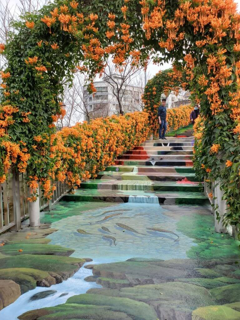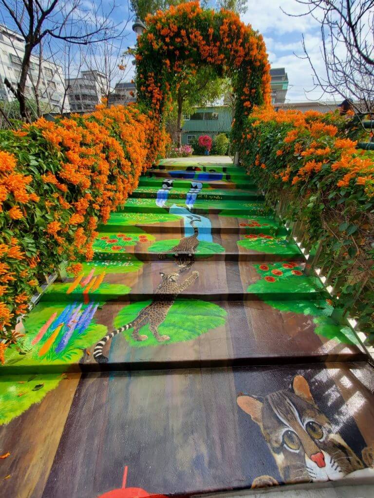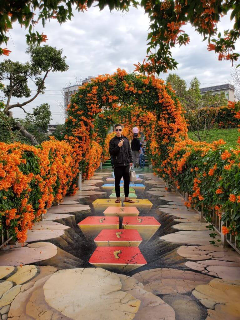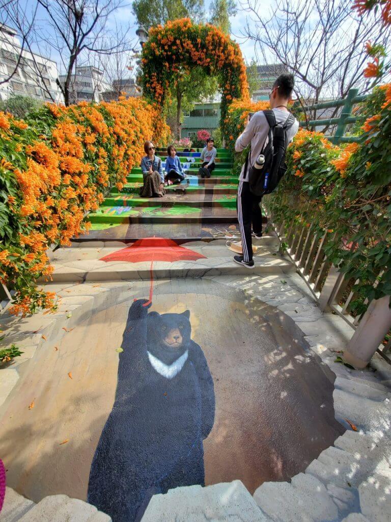 而在炮仗花的拱門下,除了炮仗花能夠讓大家拿起相機外,還有地上的3D彩繪也讓不少人拍下一幕幕的趣味畫面呢