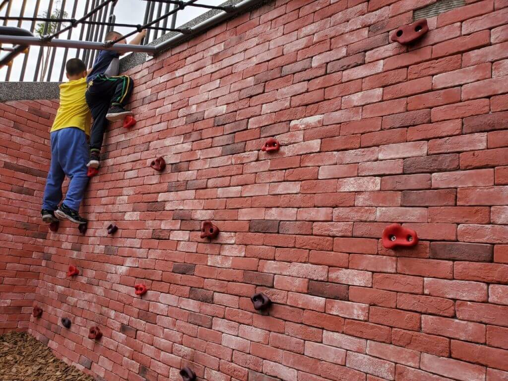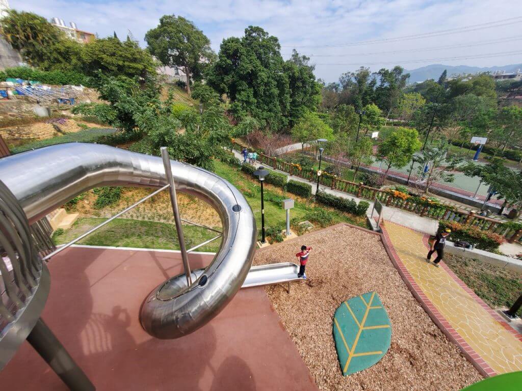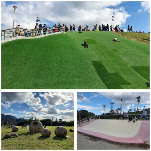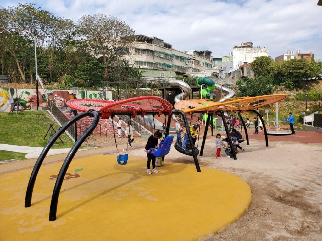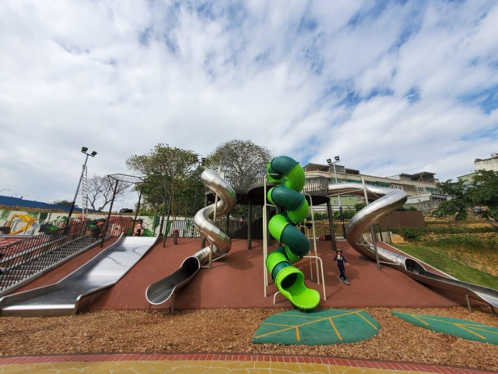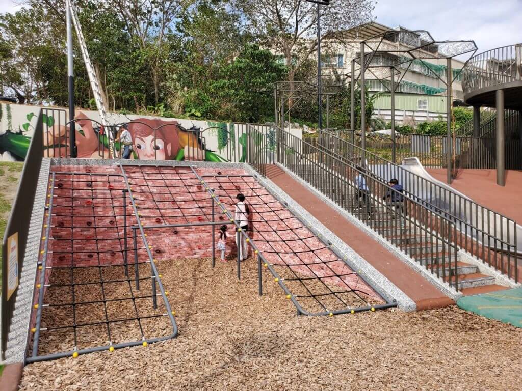 永吉公園設計了4種不同樣式的溜滑梯,在溜滑梯旁還有網子和矮牆的攀岩,而網子和攀岩的區塊下,則是使用木屑舖置,讓小朋友不小心掉下來的時候,還能有緩衝的作用,摔下來也比較不痛呢