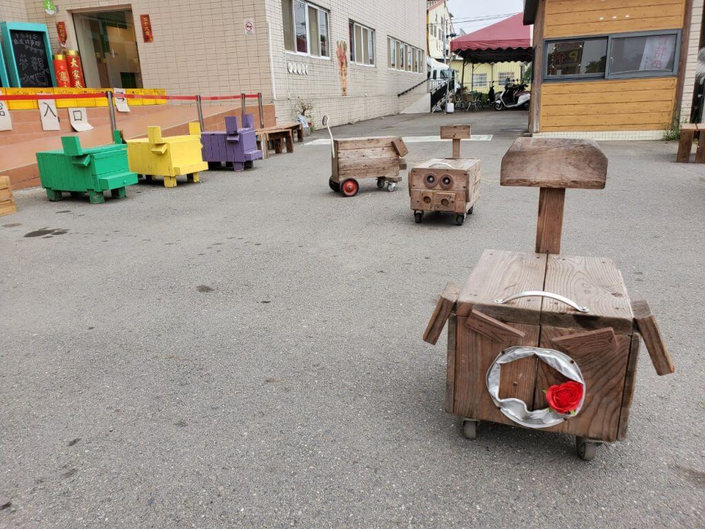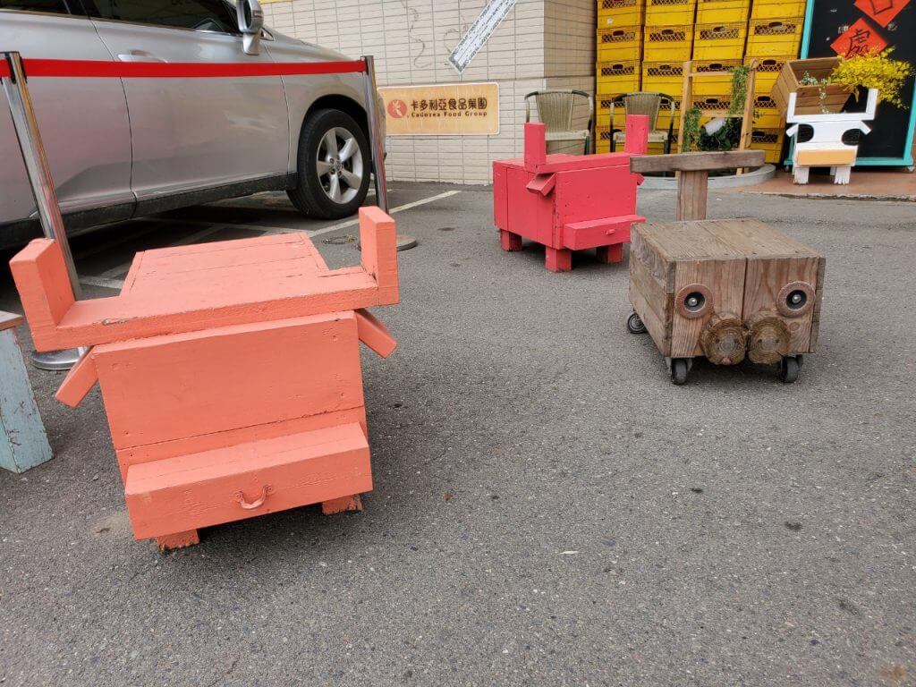 而在大門口前面則是有好多用木頭做成的牛牛、小豬和狗狗,分佈在各個角落,顏色也很繽紛,光是大門口就可以拍很多照片呢~~